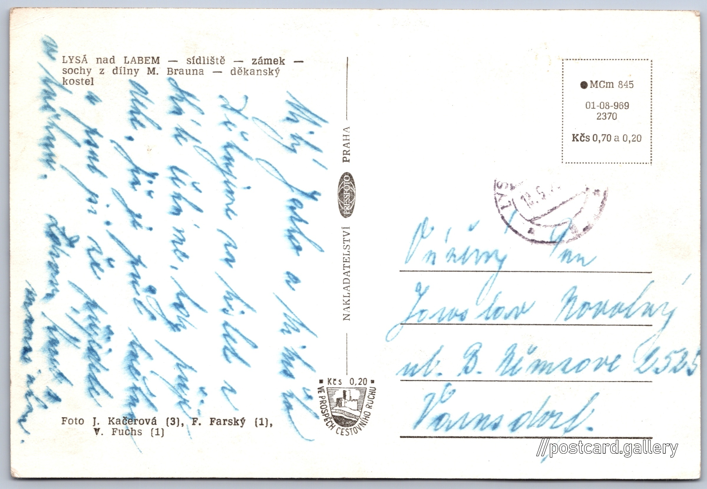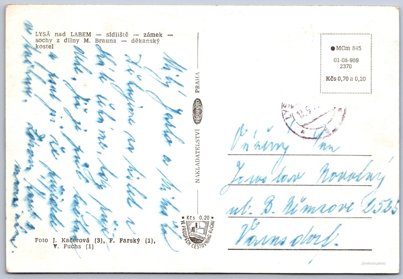Lysá nad Labem Pokud chcete vidět pohlednice ve vyšším rozlišení nebo zobrazovat jejich zadní stranu, tak se prosím nejdříve přihlašte Přihlásit Zaregistrovat Lysá nad Labem LYSÁ nad LABEM- sídliště- zámek- sochy z dílny M. Brauna- děkanský kostel Jazyk tištěného textu na pohlednici: čeština Zámek 1/21, Lysá nad Labem, 289 22, Nymburk ukázat na mapě V blízkém okolí místa zobrazeného na pohlednici lze najít 1 jinou pohlednici. Zobrazit blízké pohlednice Vydavatel: PressFoto Praha (Československo) Rok vydání pohlednice: 1969 Velikost (š x v) a tvar pohlednice: 147 x 100 mm (5.79" x 3.94"), obdélník Osoby spjaté s touto pohlednicí: Václav Fuchs(Autor fotografie) Jarmila Kačerová(Autor fotografie) Fr. Farský(Autor fotografie) Matyáš Bernard Braun(Obsah pohlednice) Prošlá poštou Ceny: Cena pohlednice: 0,70 Kčs (CSK) (+0,20 Kčs přípl. na tur. ruch) Kódy na pohlednici: •MCm 845 01-08-969 2370 DiskuseVložit příspěvek Přidat novou složku ... Spravovat složky ...