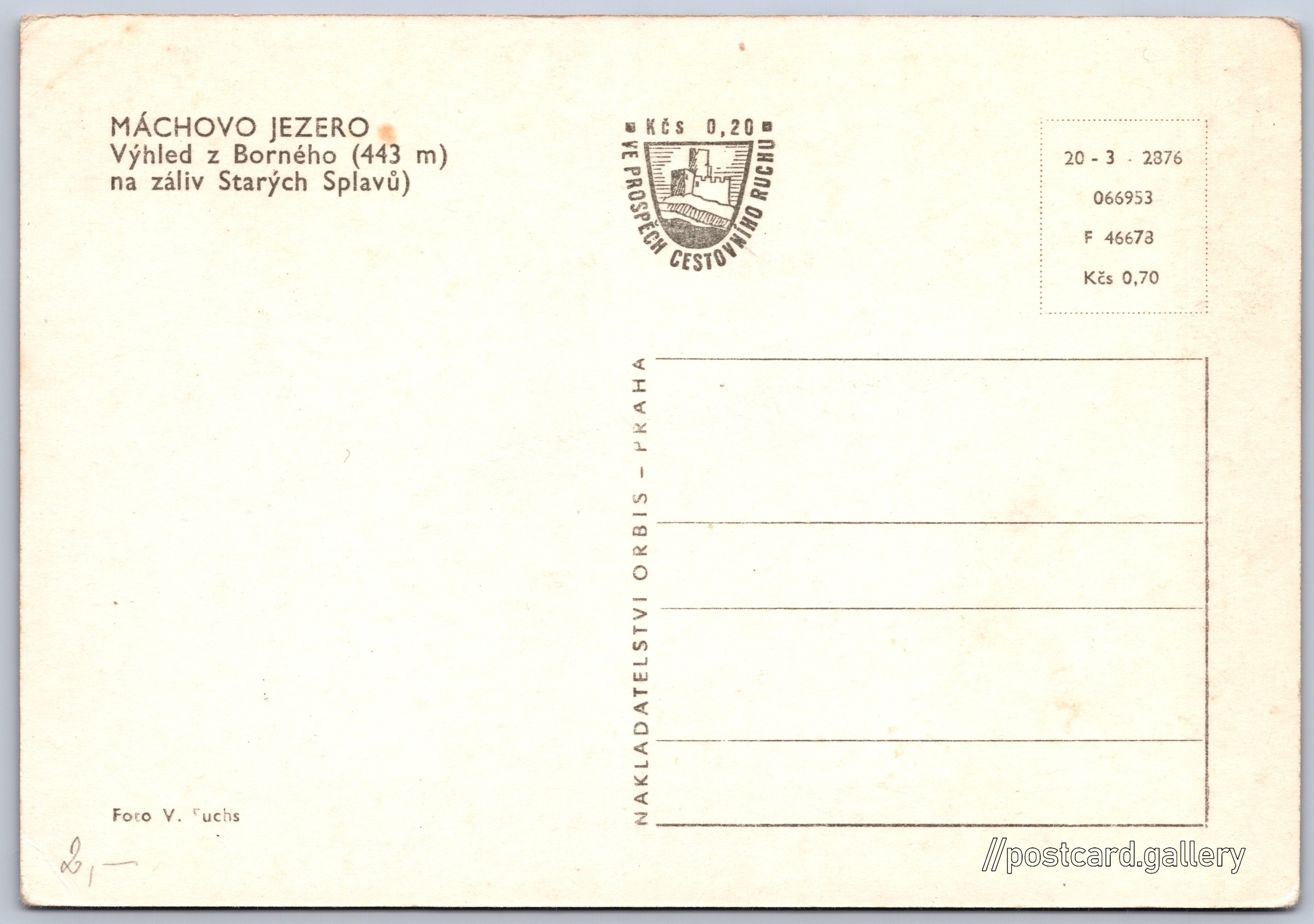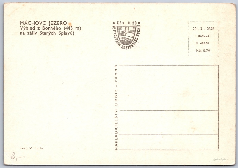 Máchovo jezero, výhled na Staré splavy 4/11 Pokud chcete vidět pohlednice ve vyšším rozlišení nebo zobrazovat jejich zadní stranu, tak se prosím nejdříve přihlašte Přihlásit Zaregistrovat MÁCHOVO JEZEROVýhled z Borného (443 m) na záliv Starých Splavů) Jazyk tištěného textu na pohlednici: čeština Borný (446 m), Hora, výškový bod, Doksy, Liberecký kraj, Česko ukázat na mapě V blízkém okolí místa zobrazeného na pohlednici lze najít 14 jiných pohlednic. Zobrazit blízké pohlednice Vydavatel: Nakladatelství Orbis (Československo) Datum vydání není známo Pomozte nám odhadnout datum vzniku pohlednice Velikost (š x v) a tvar pohlednice: 148 x 102 mm (5.83" x 4.02"), obdélník Osoby spjaté s touto pohlednicí: Václav Fuchs(Autor fotografie) Čistá pohlednice (neprošlá poštou) Ceny: Cena pohlednice: 0,70 Kčs (CSK) (+0,20 Kčs přípl. na tur. ruch) Kódy na pohlednici: 20-3-2876 066953 F 46673 DiskuseVložit příspěvek Přidat novou složku ... Spravovat složky ...