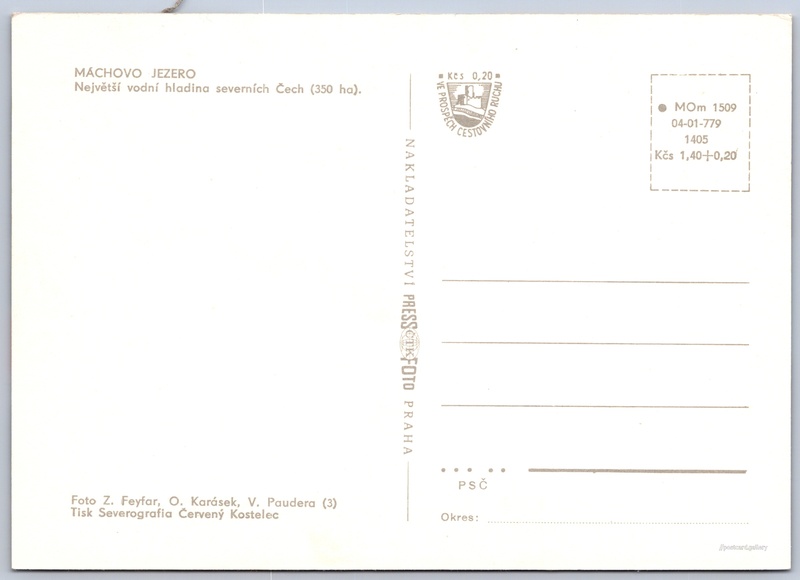 Máchovo jezero Pokud chcete vidět pohlednice ve vyšším rozlišení nebo zobrazovat jejich zadní stranu, tak se prosím nejdříve přihlašte Přihlásit Zaregistrovat Máchovo jezero MÁCHOVO JEZERONejvětší vodní hladina severních Čech (350 ha). Jazyk tištěného textu na pohlednici: čeština Doksy, Česká Lípa ukázat na mapě V blízkém okolí místa zobrazeného na pohlednici lze najít 14 jiných pohlednic. Zobrazit blízké pohlednice Vydavatel: PressFoto Praha (Československo) Rok vydání pohlednice: 1977 Velikost (š x v) a tvar pohlednice: 148 x 106 mm (5.83" x 4.17"), obdélník Osoby spjaté s touto pohlednicí: Zdenko Feyfar(Autor fotografie) Oldřich Karásek(Autor fotografie) Vl. Paudera(Autor fotografie) Čistá pohlednice (neprošlá poštou) Ceny: Cena pohlednice: 1,40 Kčs (CSK) (+0,20 Kčs přípl. na tur. ruch) Kódy na pohlednici: •MOm 1509 04-01-779 1405 DiskuseVložit příspěvek Přidat novou složku ... Spravovat složky ...