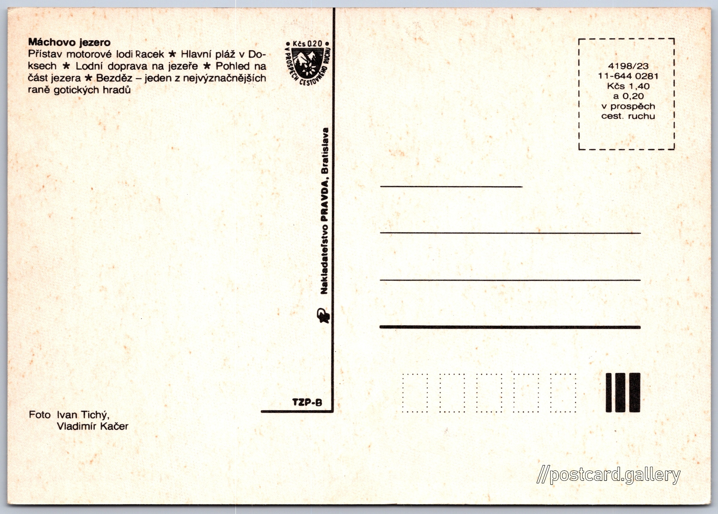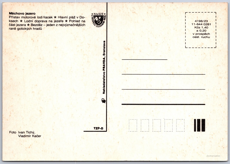 Máchovo jezero Pokud chcete vidět pohlednice ve vyšším rozlišení nebo zobrazovat jejich zadní stranu, tak se prosím nejdříve přihlašte Přihlásit Zaregistrovat Máchovo jezero- Přístav motorové lodi Racek- Hlavní pláž v Doksech- Lodní doprava na jezeře- Pohled na část jezera- Bezděz - jeden z nejvýznačnějších raně gotických hradů Jazyk tištěného textu na pohlednici: čeština Přístaviště Racek, Přístav, Doksy, Liberecký kraj, Česko ukázat na mapě V blízkém okolí místa zobrazeného na pohlednici lze najít 18 jiných pohlednic. Zobrazit blízké pohlednice Vydavatel: Nakladateľstvo PRAVDA, Bratislava (Československo) Rok vydání pohlednice: únor, 1981 Velikost (š x v) a tvar pohlednice: 147 x 103 mm (5.79" x 4.06"), obdélník Osoby spjaté s touto pohlednicí: Vladimír Kačer(Autor fotografie) Ivan Tichý(Autor fotografie) Čistá pohlednice (neprošlá poštou) Ceny: Cena pohlednice: 1,40 Kčs (CSK) (+0,20 Kčs přípl. na tur. ruch) Kódy na pohlednici: 4198/23 11-644 0281 DiskuseVložit příspěvek Přidat novou složku ... Spravovat složky ...