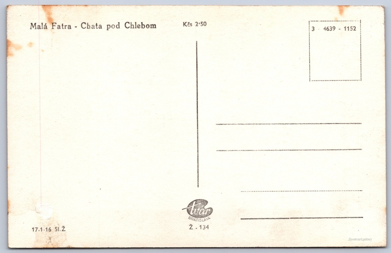 Malá Fatra, chata pod Chlebom Pokud chcete vidět pohlednice ve vyšším rozlišení nebo zobrazovat jejich zadní stranu, tak se prosím nejdříve přihlašte Přihlásit Zaregistrovat Malá Fatra - Chata pod Chlebom Jazyk tištěného textu na pohlednici: slovenština Chata pod Chlebom, Chata, bouda, Šútovo 198, Šútovo, Slovensko ukázat na mapě V blízkém okolí místa zobrazeného na pohlednici lze najít 14 jiných pohlednic. Zobrazit blízké pohlednice Vydavatel: Tvar Bratislava (Československo) Rok vydání pohlednice: listopad, 1952 Velikost (š x v) a tvar pohlednice: 138 x 90 mm (5.43" x 3.54"), obdélník Čistá pohlednice (neprošlá poštou) Ceny: Cena pohlednice: 2,50 Kčs (CSK) Kódy na pohlednici: 3 4639 1152 Ž-134 17-1-16 Sl.Ž. DiskuseVložit příspěvek Přidat novou složku ... Spravovat složky ...