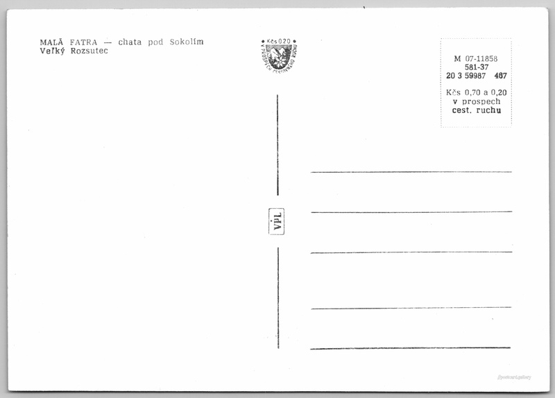 Malá Fatra, chata Pod Sokolím Pokud chcete vidět pohlednice ve vyšším rozlišení nebo zobrazovat jejich zadní stranu, tak se prosím nejdříve přihlašte Přihlásit Zaregistrovat MALÁ FATRA - chata pod SokolímVeľký Rozsutec Jazyk tištěného textu na pohlednici: slovenština Hotel Pod Sokolím, Vrátna dolina, Terchová, Slovensko ukázat na mapě V blízkém okolí místa zobrazeného na pohlednici lze najít 24 jiných pohlednic. Zobrazit blízké pohlednice Vydavatel: VPL (Československo) Rok vydání pohlednice: duben, 1967 Velikost (š x v) a tvar pohlednice: 145 x 102 mm (5.71" x 4.02"), obdélník Čistá pohlednice (neprošlá poštou) Ceny: Cena pohlednice: 0,70 Kčs (CSK) (+0,20 Kčs přípl. na tur. ruch) Kódy na pohlednici: M 07-11858 581-37 20 3 59987 467 DiskuseVložit příspěvek Přidat novou složku ... Spravovat složky ...