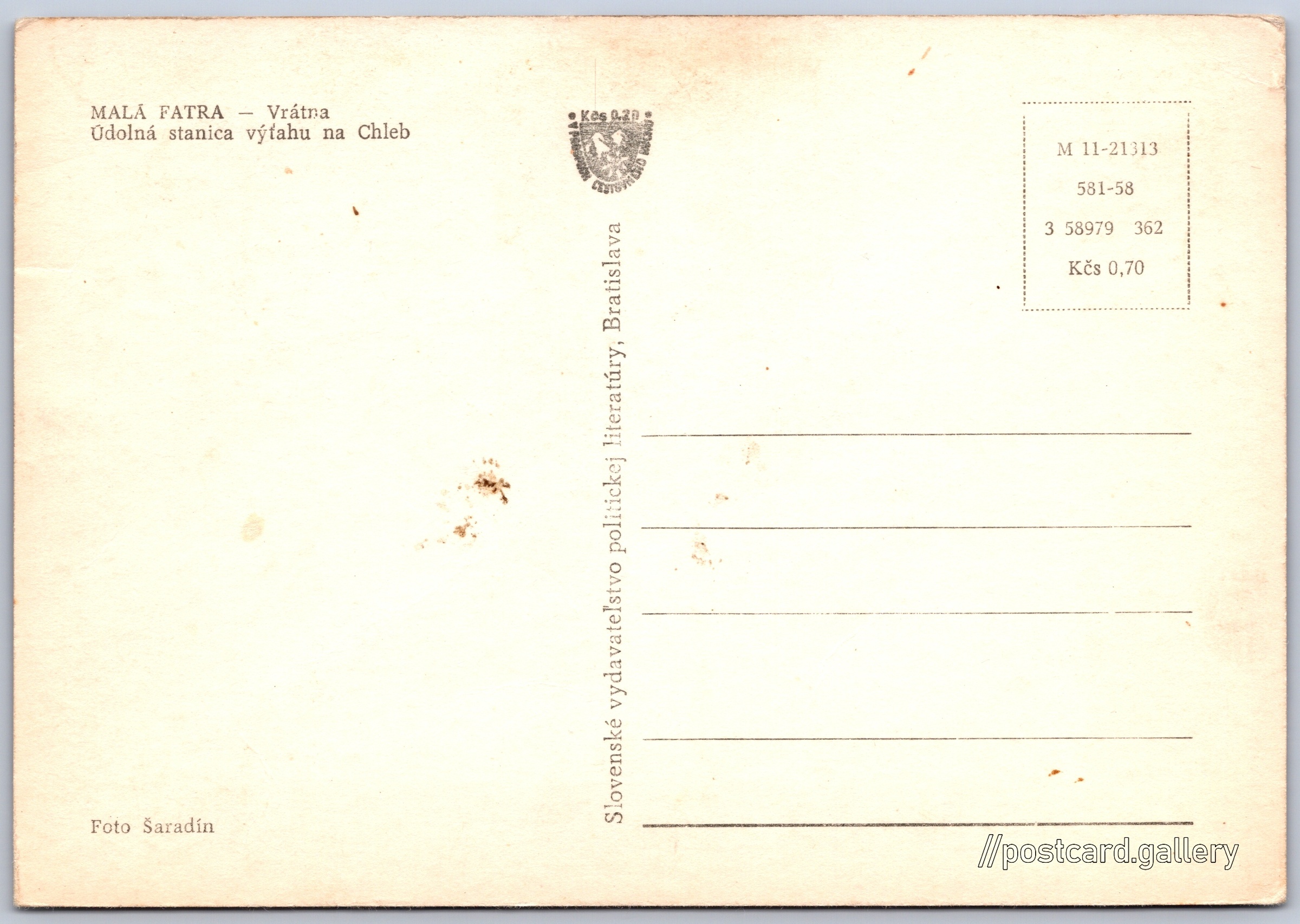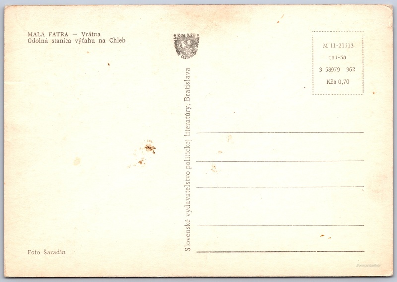Malá Fatra, lanovka na Chleb Pokud chcete vidět pohlednice ve vyšším rozlišení nebo zobrazovat jejich zadní stranu, tak se prosím nejdříve přihlašte Přihlásit Zaregistrovat MALÁ FATRA - VrátnaÚdolná stanica výťahu na Chleb Jazyk tištěného textu na pohlednici: slovenština Terchová ukázat na mapě V blízkém okolí místa zobrazeného na pohlednici lze najít 27 jiných pohlednic. Zobrazit blízké pohlednice Vydavatel: VPL (Československo) Rok vydání pohlednice: březen, 1962 Velikost (š x v) a tvar pohlednice: 145 x 101 mm (5.71" x 3.98"), obdélník Osoby spjaté s touto pohlednicí: Šaradín(Autor fotografie) Čistá pohlednice (neprošlá poštou) Ceny: Cena pohlednice: 0,70 Kčs (CSK) (+0,20 Kčs přípl. na tur. ruch) Kódy na pohlednici: M 11-21313 581-58 3 58979 362 DiskuseVložit příspěvek Přidat novou složku ... Spravovat složky ...