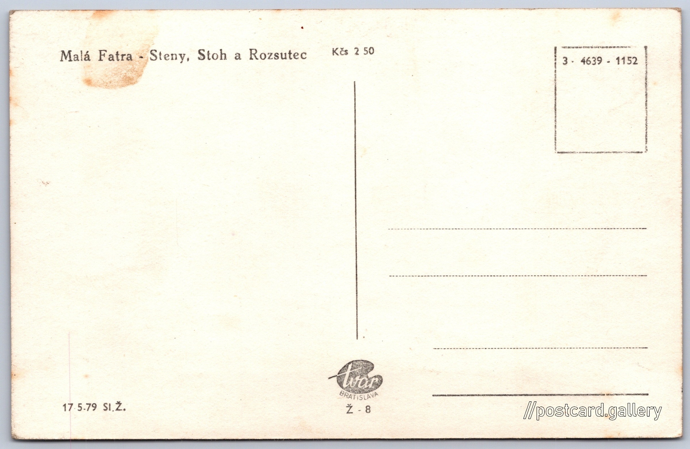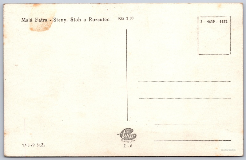 Malá Fatra, Steny, Stoh a Rozsutec Pokud chcete vidět pohlednice ve vyšším rozlišení nebo zobrazovat jejich zadní stranu, tak se prosím nejdříve přihlašte Přihlásit Zaregistrovat Malá Fatra - Steny, Stoh a Rozsutec Jazyk tištěného textu na pohlednici: slovenština Steny (1572 m), Hora, výškový bod, Šútovo, Slovensko ukázat na mapě V blízkém okolí místa zobrazeného na pohlednici lze najít 31 jiných pohlednic. Zobrazit blízké pohlednice Vydavatel: Tvar Bratislava (Československo) Datum vydání není známo Pomozte nám odhadnout datum vzniku pohlednice Velikost (š x v) a tvar pohlednice: 139 x 89 mm (5.47" x 3.50"), obdélník Čistá pohlednice (neprošlá poštou) Ceny: Cena pohlednice: 2,50 Kčs (CSK) Kódy na pohlednici: 3-4639-1152 Ž-8 17 5-79 Sl.Ž. DiskuseVložit příspěvek Přidat novou složku ... Spravovat složky ...