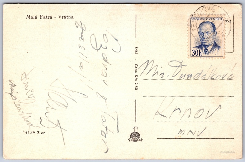Malá Fatra, Vrátna dolina 7/30 Pokud chcete vidět pohlednice ve vyšším rozlišení nebo zobrazovat jejich zadní stranu, tak se prosím nejdříve přihlašte Přihlásit Zaregistrovat Malá Fatra - VrátnaduringSpay from17-19 Z orZues//e€drav240)5461Cena Kčs 2.50OVACESKOSLOVENSKO30h4. PGS-JINDRAS.952Min. Dur2. DundálkovenLanovMNV Jazyk tištěného textu na pohlednici: slovenština Vrátna dolina, Turistická atrakce, Terchová, Slovensko ukázat na mapě V blízkém okolí místa zobrazeného na pohlednici lze najít 20 jiných pohlednic. Zobrazit blízké pohlednice Vydavatel: Tatran (Československo) Odhadované datum vydání pohlednice: 1948 - 1953 Pomozte nám zpřesnit rok vzniku pohlednice Velikost (š x v) a tvar pohlednice: 139 x 91 mm (5.47" x 3.58"), obdélník Prošlá poštou Ceny: Cena pohlednice: 2,50 Kčs (CSK)Vyplacené známky: 0,30 Kčs (CSK) Kódy na pohlednici: 17-19 Z or 5461 DiskuseVložit příspěvek Přidat novou složku ... Spravovat složky ...