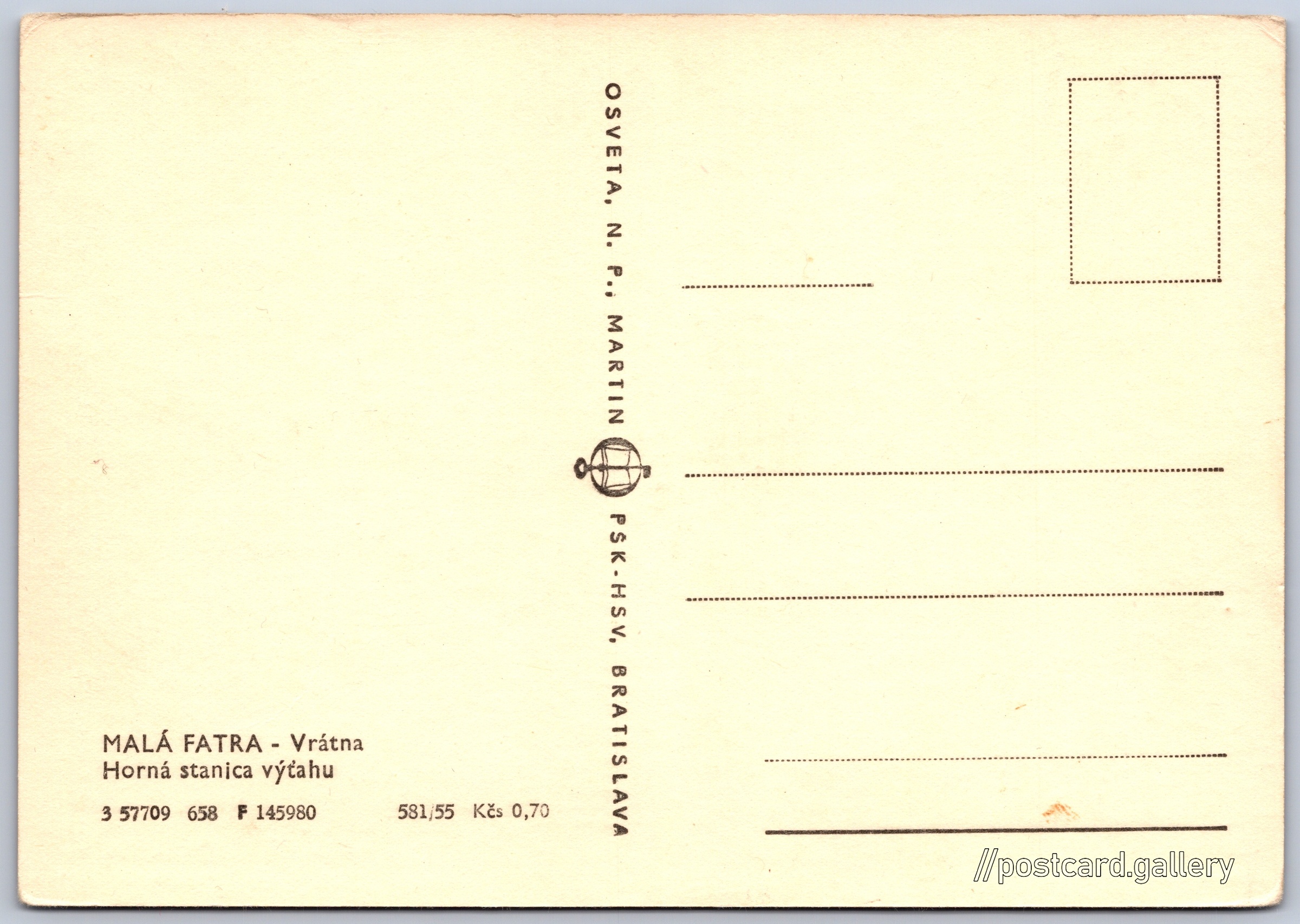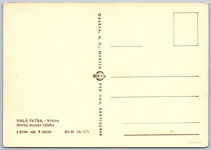 Malá Fatra, Vrátna, horní stanice lanovky 8/14 Pokud chcete vidět pohlednice ve vyšším rozlišení nebo zobrazovat jejich zadní stranu, tak se prosím nejdříve přihlašte Přihlásit Zaregistrovat MALÁ FATRA - VrátnaHorná stanica výťahu Jazyk tištěného textu na pohlednici: slovenština Vrátna - Chleb, Stanice lanovky, vleku, Terchová, Slovensko ukázat na mapě V blízkém okolí místa zobrazeného na pohlednici lze najít 23 jiných pohlednic. Zobrazit blízké pohlednice Vydavatel: Osveta, n. p., Martin PŠK - Bratislava (Československo) Rok vydání pohlednice: červen, 1958 Velikost (š x v) a tvar pohlednice: 147 x 103 mm (5.79" x 4.06"), obdélník Čistá pohlednice (neprošlá poštou) Ceny: Cena pohlednice: 0,70 Kčs (CSK) Kódy na pohlednici: 3 57709 658 F 145980 581/55 DiskuseVložit příspěvek Přidat novou složku ... Spravovat složky ...