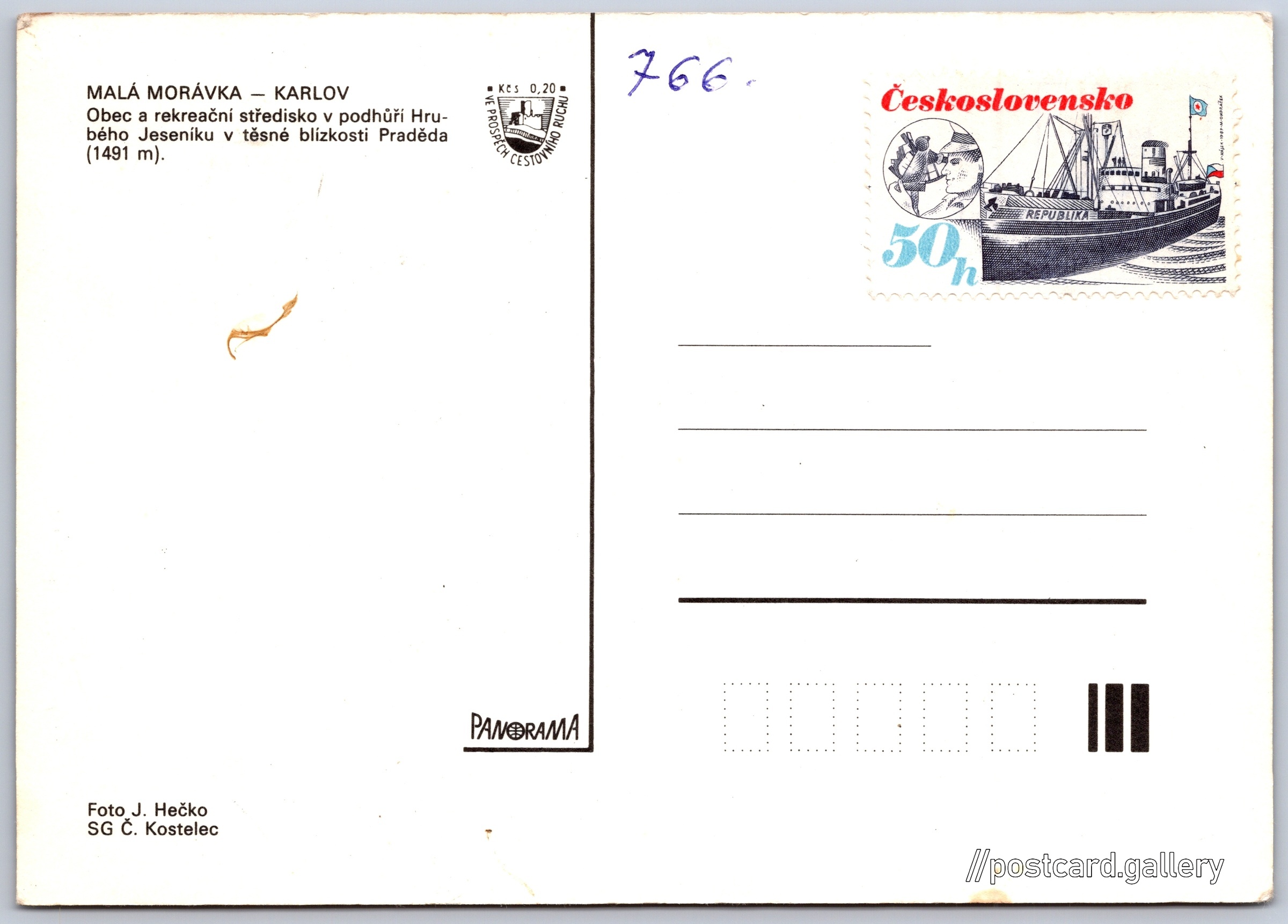 Malá Morávka, Karlov 10/15 Pokud chcete vidět pohlednice ve vyšším rozlišení nebo zobrazovat jejich zadní stranu, tak se prosím nejdříve přihlašte Přihlásit Zaregistrovat Malá MorávkaKarlov MALÁ MORÁVKA - KARLOVObec a rekreační středisko v podhůří Hrubého Jeseníku v těsné blízkosti Praděda (1491 m). Jazyk tištěného textu na pohlednici: čeština Malá Morávka ev. č. 185, Malá Morávka, 793 36, Bruntál ukázat na mapě Vydavatel: Panorama (Československo) Datum vydání není známo Pomozte nám odhadnout datum vzniku pohlednice Velikost (š x v) a tvar pohlednice: 148 x 105 mm (5.83" x 4.13"), obdélník Osoby spjaté s touto pohlednicí: J. Hečko(Autor fotografie) Čistá pohlednice (neprošlá poštou) Ceny: Příplatek na tur. ruch: 0,20 Kčs (CSK))Vyplacené známky: 0,50 Kčs (CSK) DiskuseVložit příspěvek Přidat novou složku ... Spravovat složky ...