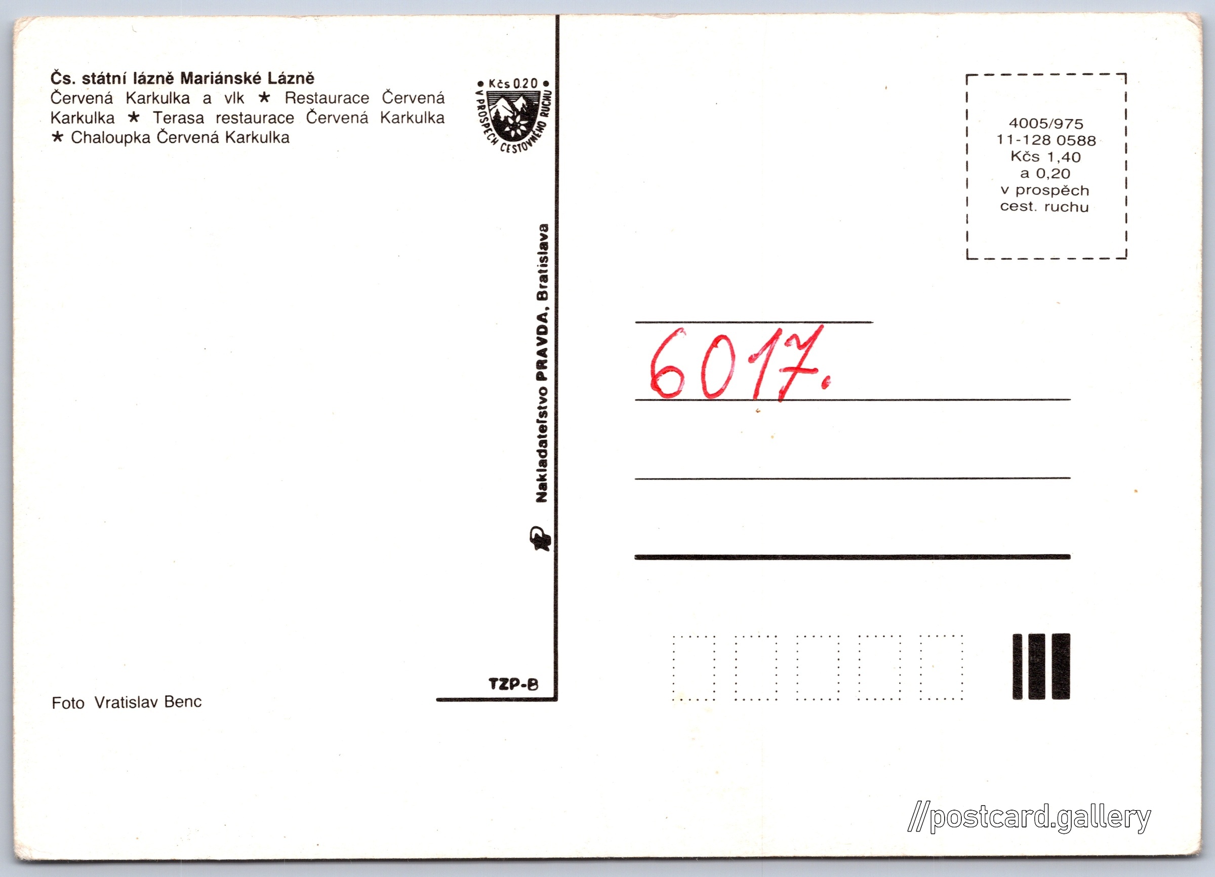 Mariánské Lázně, Červená Karkulka Pokud chcete vidět pohlednice ve vyšším rozlišení nebo zobrazovat jejich zadní stranu, tak se prosím nejdříve přihlašte Přihlásit Zaregistrovat Mariánské Lázně Čs. státní lázně Mariánské Lázně- Červená Karkulka a vlk- Restaurace Červená Karkulka- Terasa restaurace Červená Karkulka- Chaloupka Červená Karkulka Jazyk tištěného textu na pohlednici: čeština Zeyerova 145/17, Mariánské Lázně, 353 01, Cheb ukázat na mapě Vydavatel: Nakladateľstvo PRAVDA, Bratislava (Československo) Rok vydání pohlednice: květen, 1988 Velikost (š x v) a tvar pohlednice: 148 x 106 mm (5.83" x 4.17"), obdélník Osoby spjaté s touto pohlednicí: Vratislav Benc(Autor fotografie) Čistá pohlednice (neprošlá poštou) Ceny: Cena pohlednice: 1,40 Kčs (CSK) (+0,20 Kčs přípl. na tur. ruch) Kódy na pohlednici: 4005/975 11-128 0588 DiskuseVložit příspěvek Přidat novou složku ... Spravovat složky ...
