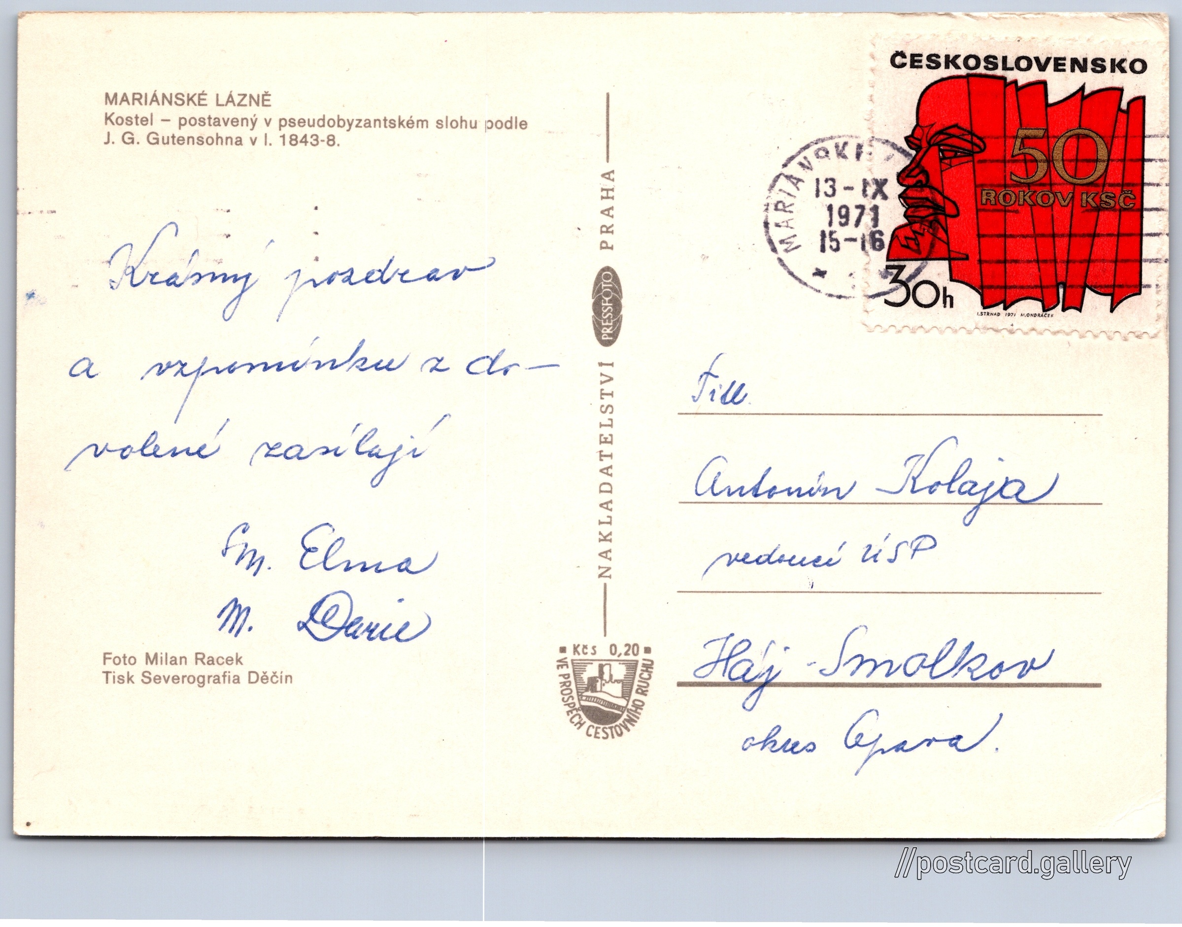Mariánské lázně, kostel Nanebevzetí Panny Marie 4/52 Pokud chcete vidět pohlednice ve vyšším rozlišení nebo zobrazovat jejich zadní stranu, tak se prosím nejdříve přihlašte Přihlásit Zaregistrovat MARIÁNSKÉ LÁZNĚKostel - postavený v pseudobyzantském slohu podle J. G. Gutensohna v I. 1843-8. Jazyk tištěného textu na pohlednici: čeština Kostel Nanebevzetí Panny Marie, Kostel, Goethovo náměstí 110/31, Mariánské Lázně, Česko ukázat na mapě V blízkém okolí místa zobrazeného na pohlednici lze najít 52 jiných pohlednic. Zobrazit blízké pohlednice Vydavatel: PressFoto Praha (Československo) Odhadované datum vydání pohlednice: 1968 - 1971 Pomozte nám zpřesnit rok vzniku pohlednice Velikost (š x v) a tvar pohlednice: 147 x 105 mm (5.79" x 4.13"), obdélník Osoby spjaté s touto pohlednicí: Milan Racek(Autor fotografie) Prošlá poštou:Datum na razítku: 13.9.1971 Ceny: Příplatek na tur. ruch: 0,20 Kčs (CSK))Vyplacené známky: 0,30 Kčs (CSK) DiskuseVložit příspěvek Přidat novou složku ... Spravovat složky ...