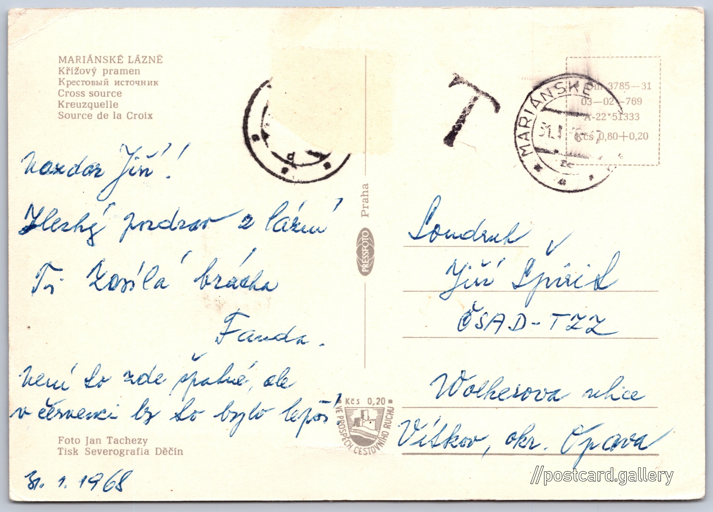 Mariánské Lázně, Křížový pramen Pokud chcete vidět pohlednice ve vyšším rozlišení nebo zobrazovat jejich zadní stranu, tak se prosím nejdříve přihlašte Přihlásit Zaregistrovat MARIÁNSKÉ LÁZNĚ- Křížový pramen- Крестовый источник- Cross source- Kreuzquelle- Source de la Croix Jazyky tištěného textu na pohlednici: čeština, ruština, angličtina, němčina, francouzština, francouzština Mariánské Lázně, Cheb ukázat na mapě V blízkém okolí místa zobrazeného na pohlednici lze najít 52 jiných pohlednic. Zobrazit blízké pohlednice Vydavatel: PressFoto Praha (Československo) Rok vydání pohlednice: 1967 Velikost (š x v) a tvar pohlednice: 148 x 105 mm (5.83" x 4.13"), obdélník Osoby spjaté s touto pohlednicí: Jan Tachezy(Autor fotografie) Prošlá poštou:Datum na razítku: 31.1.1968Datum napsání pohledu: 31.1.1968 Ceny: Cena pohlednice: 0,80 Kčs (CSK) (+0,20 Kčs přípl. na tur. ruch) Kódy na pohlednici: •Om 3785-31 03-02-769 A-22*51333 DiskuseVložit příspěvek Přidat novou složku ... Spravovat složky ...