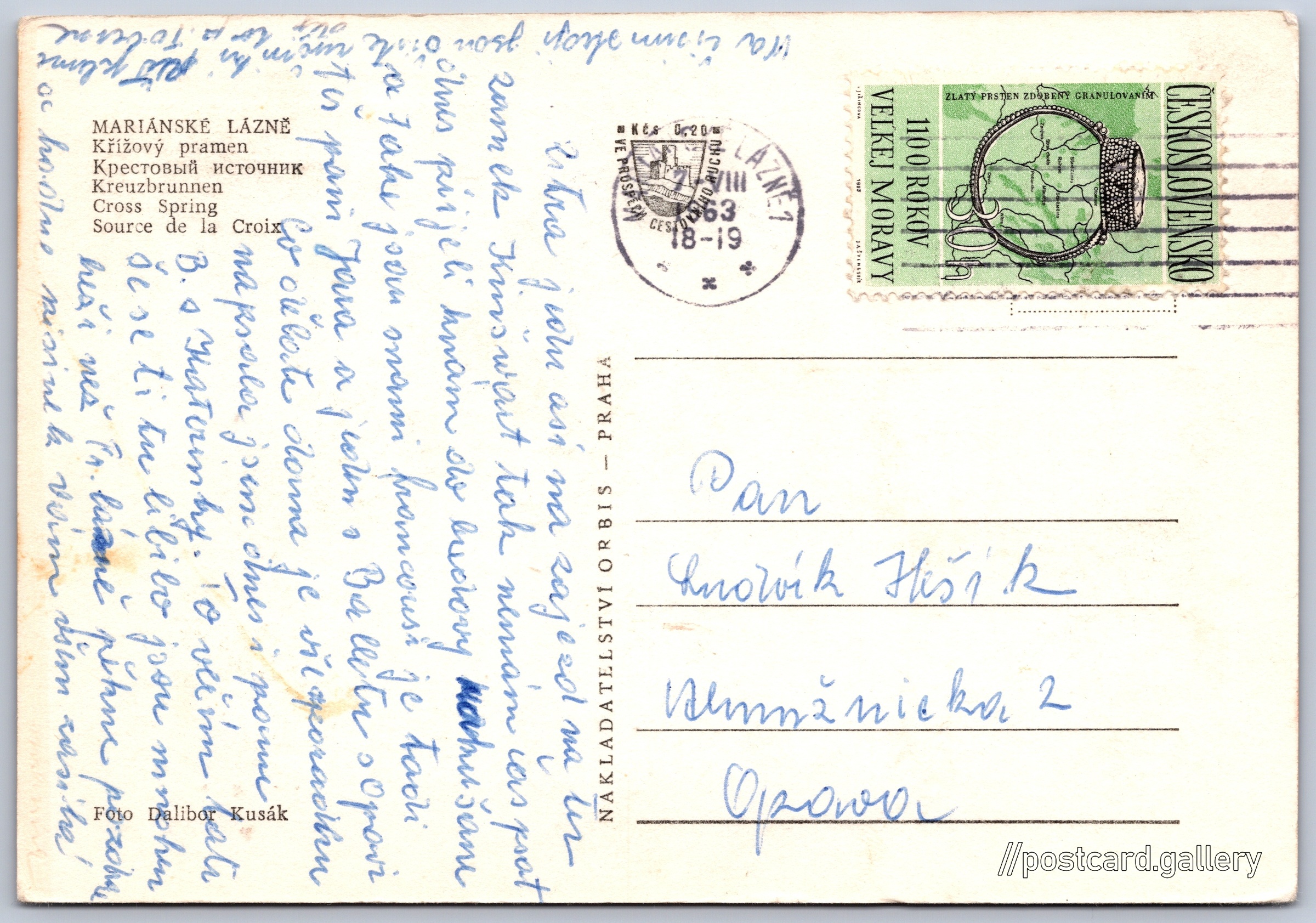 Mariánské lázně, Křížový pramen 7/52 Pokud chcete vidět pohlednice ve vyšším rozlišení nebo zobrazovat jejich zadní stranu, tak se prosím nejdříve přihlašte Přihlásit Zaregistrovat MARIÁNSKÉ LÁZNĚ- Křížový pramen- Крестовый источник- Kreuzbrunnen- Cross Spring- Source de la Croix Jazyk tištěného textu na pohlednici: čeština Křížový pramen, Minerální pramen, Mariánské Lázně, Česko ukázat na mapě V blízkém okolí místa zobrazeného na pohlednici lze najít 52 jiných pohlednic. Zobrazit blízké pohlednice Vydavatel: Nakladatelství Orbis (Československo) Odhadované datum vydání pohlednice: 1960 - 1963 Pomozte nám zpřesnit rok vzniku pohlednice Velikost (š x v) a tvar pohlednice: 149 x 103 mm (5.87" x 4.06"), obdélník Osoby spjaté s touto pohlednicí: Dalibor Kusák(Autor fotografie) Prošlá poštou:Datum na razítku: 7.8.1963 Ceny: Příplatek na tur. ruch: 0,20 Kčs (CSK))Vyplacené známky: 0,30 Kčs (CSK) DiskuseVložit příspěvek Přidat novou složku ... Spravovat složky ...