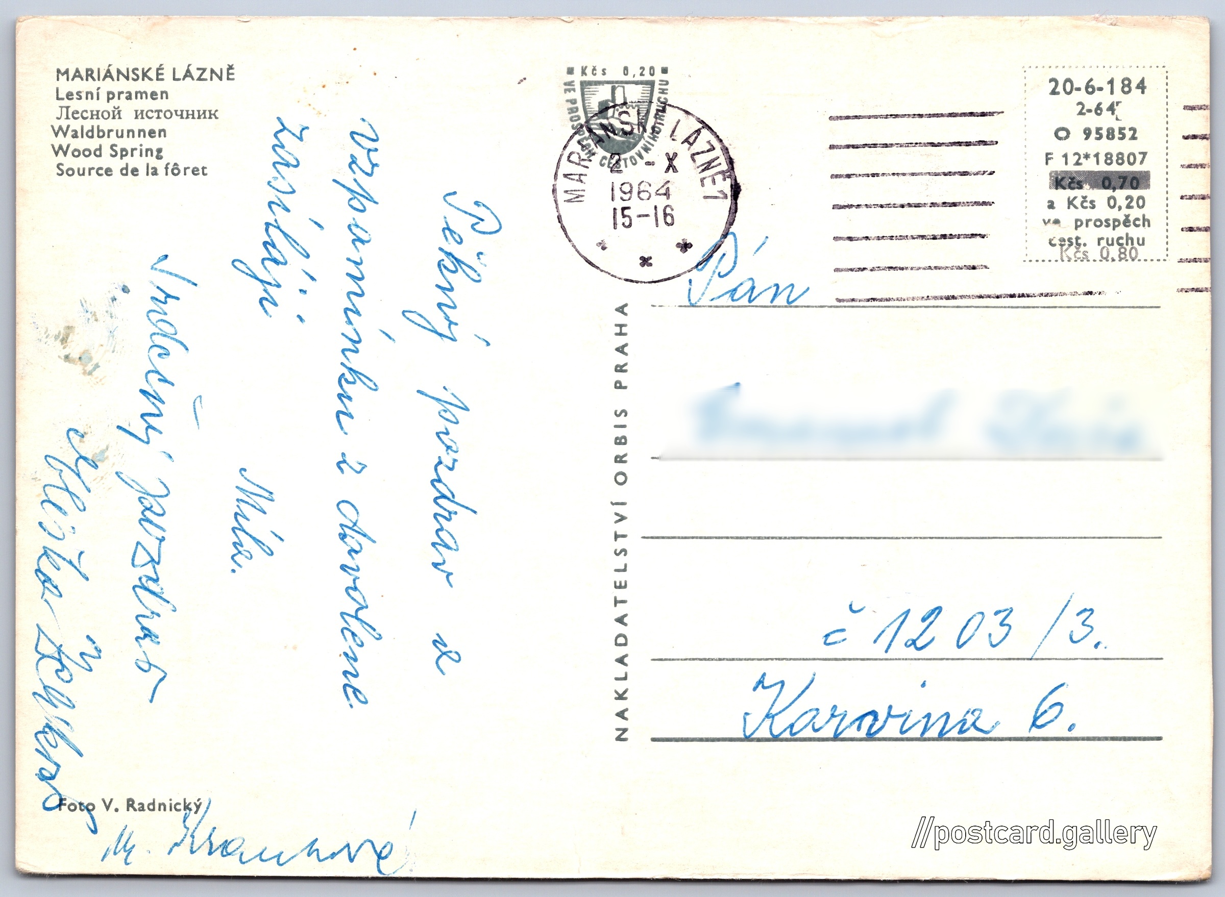 Mariánské Lázně, Lesní pramen Pokud chcete vidět pohlednice ve vyšším rozlišení nebo zobrazovat jejich zadní stranu, tak se prosím nejdříve přihlašte Přihlásit Zaregistrovat MARIÁNSKÉ LÁZNĚ- Lesní pramen- Лесной источник- Waldbrunnen- Wood Spring- Source de la fôret Jazyky tištěného textu na pohlednici: čeština, ruština, němčina, angličtina, francouzština, francouzština Mariánské Lázně, Cheb ukázat na mapě V blízkém okolí místa zobrazeného na pohlednici lze najít 52 jiných pohlednic. Zobrazit blízké pohlednice Vydavatel: Nakladatelství Orbis (Československo) Rok vydání pohlednice: únor, 1964 Velikost (š x v) a tvar pohlednice: 146 x 105 mm (5.75" x 4.13"), obdélník Osoby spjaté s touto pohlednicí: Viktor Radnický(Autor fotografie) Prošlá poštou:Datum na razítku: 2.10.1964 Ceny: Cena pohlednice: 0,80 Kčs (CSK) (+0,20 Kčs přípl. na tur. ruch) Kódy na pohlednici: 20-6-184 2-64 O 95852 F 12*18807 DiskuseVložit příspěvek Přidat novou složku ... Spravovat složky ...