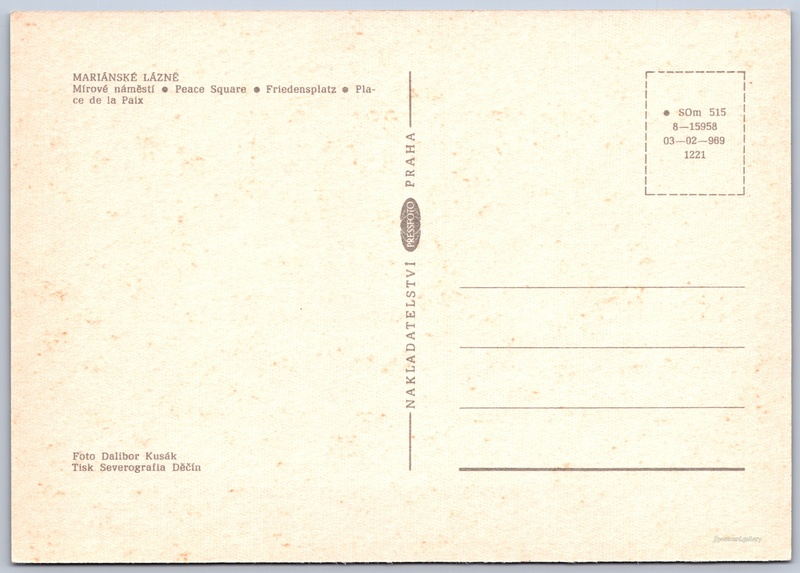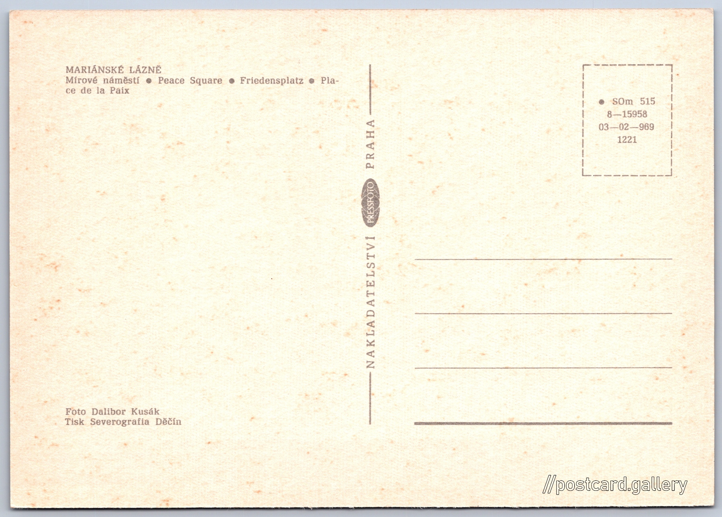 Mariánské Lázně, Mírové náměstí 4/52 Pokud chcete vidět pohlednice ve vyšším rozlišení nebo zobrazovat jejich zadní stranu, tak se prosím nejdříve přihlašte Přihlásit Zaregistrovat MARIÁNSKÉ LÁZNĚ- Mírové náměstí- Peace Square- Friedensplatz- Place de la Paix Jazyky tištěného textu na pohlednici: čeština, angličtina, němčina, francouzština Mírové náměstí, Mariánské Lázně, Cheb ukázat na mapě V blízkém okolí místa zobrazeného na pohlednici lze najít 52 jiných pohlednic. Zobrazit blízké pohlednice Vydavatel: PressFoto Praha (Československo) Rok vydání pohlednice: 1969 Velikost (š x v) a tvar pohlednice: 148 x 104 mm (5.83" x 4.09"), obdélník Osoby spjaté s touto pohlednicí: Dalibor Kusák(Autor fotografie) Čistá pohlednice (neprošlá poštou) Kódy na pohlednici: •SOm 515 8-15958 03-02-969 1221 DiskuseVložit příspěvek Přidat novou složku ... Spravovat složky ...