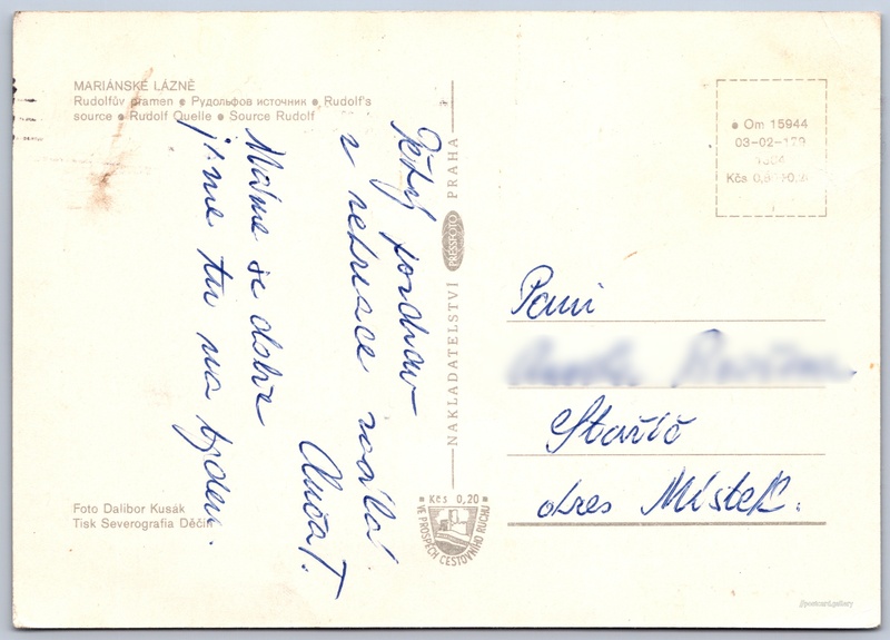 Cena pohlednice: 0,80 Kčs (CSK) (+0,20 Kčs přípl. na tur. ruch)