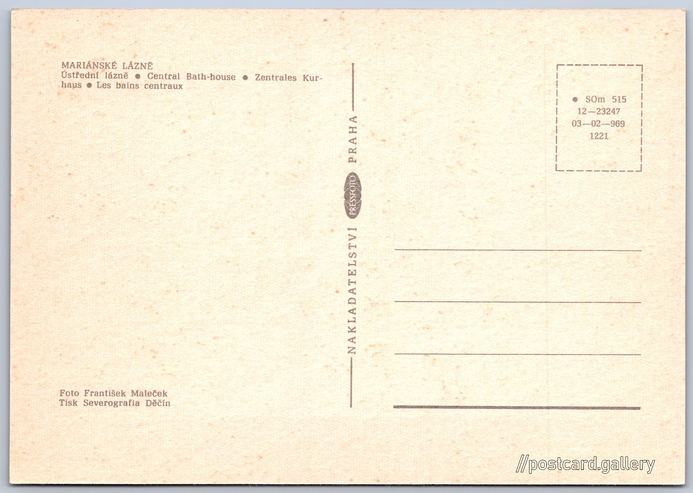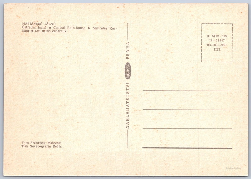 Mariánské Lázně, Ústřední lázně Pokud chcete vidět pohlednice ve vyšším rozlišení nebo zobrazovat jejich zadní stranu, tak se prosím nejdříve přihlašte Přihlásit Zaregistrovat MARIÁNSKÉ LÁZNĚ- Ústřední lázně- Central Bath-house- Zentrales Kurhaus- Les bains centraux Jazyky tištěného textu na pohlednici: čeština, angličtina, němčina, francouzština Mariánské Lázně, Cheb ukázat na mapě V blízkém okolí místa zobrazeného na pohlednici lze najít 52 jiných pohlednic. Zobrazit blízké pohlednice Vydavatel: PressFoto Praha (Československo) Rok vydání pohlednice: 1969 Velikost (š x v) a tvar pohlednice: 148 x 103 mm (5.83" x 4.06"), obdélník Osoby spjaté s touto pohlednicí: František Maleček(Autor fotografie) Čistá pohlednice (neprošlá poštou) Kódy na pohlednici: •SOm 515 12-23247 03-02-969 1221 DiskuseVložit příspěvek Přidat novou složku ... Spravovat složky ...