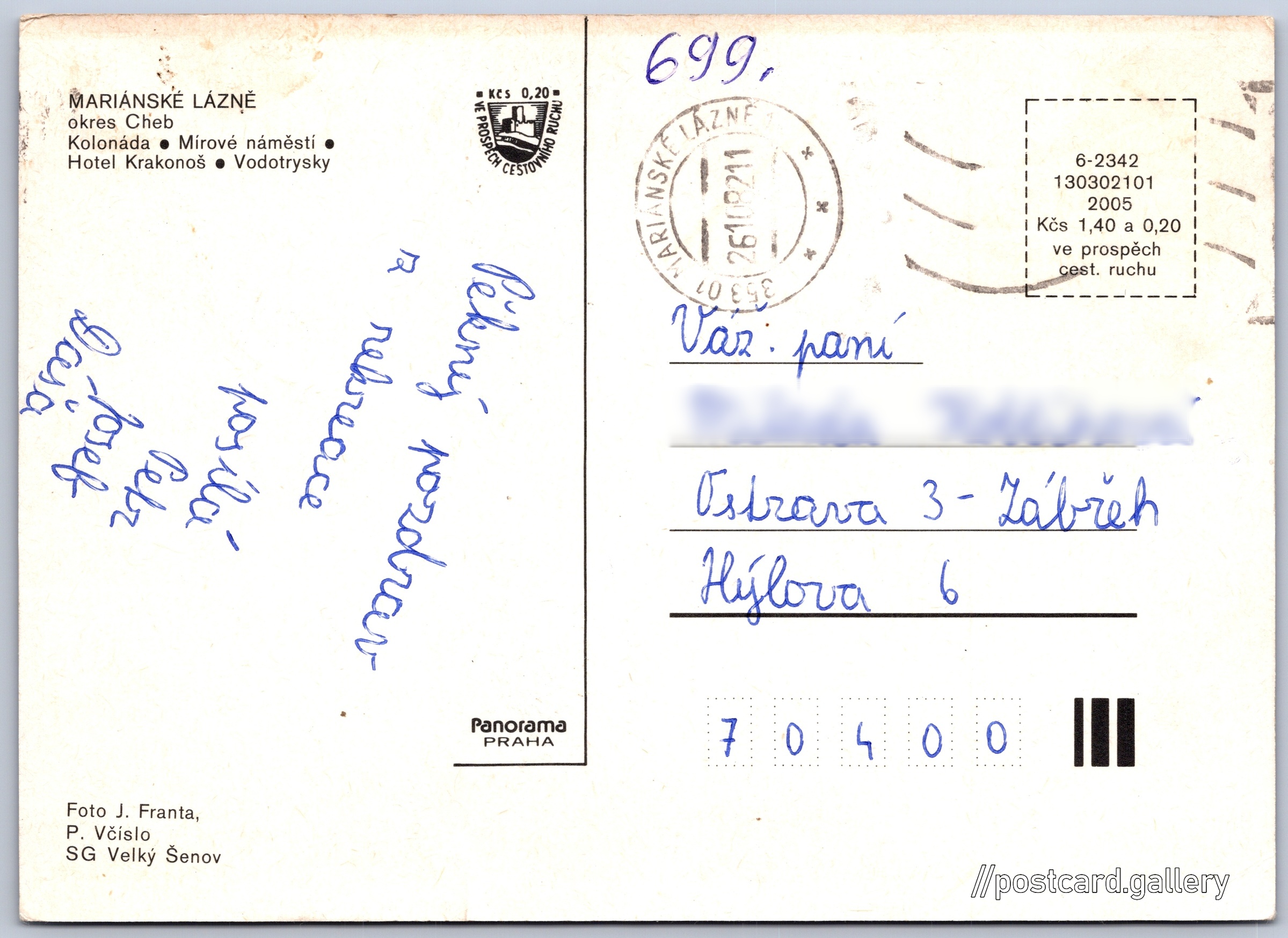Mariánské lázně 8/52 Pokud chcete vidět pohlednice ve vyšším rozlišení nebo zobrazovat jejich zadní stranu, tak se prosím nejdříve přihlašte Přihlásit Zaregistrovat Mariánské lázně MARIÁNSKÉ LÁZNĚokres Cheb- Kolonáda- Mírové náměstí- Hotel Krakonoš- Vodotrysky Jazyk tištěného textu na pohlednici: čeština Kolonáda Maxima Gorkého, Historická budova, Goethovo náměstí 625/33, Mariánské Lázně, Česko ukázat na mapě V blízkém okolí místa zobrazeného na pohlednici lze najít 52 jiných pohlednic. Zobrazit blízké pohlednice Vydavatel: Panorama (Československo) Odhadované datum vydání pohlednice: 1979 - 1982 Pomozte nám zpřesnit rok vzniku pohlednice Velikost (š x v) a tvar pohlednice: 147 x 106 mm (5.79" x 4.17"), obdélník Osoby spjaté s touto pohlednicí: J. Franta(Autor fotografie) P. Včíslo(Autor fotografie) Prošlá poštou:Datum na razítku: 26.10.1982 Ceny: Cena pohlednice: 1,40 Kčs (CSK) (+0,20 Kčs přípl. na tur. ruch) Kódy na pohlednici: 6-2342 130302101 2005 DiskuseVložit příspěvek Přidat novou složku ... Spravovat složky ...