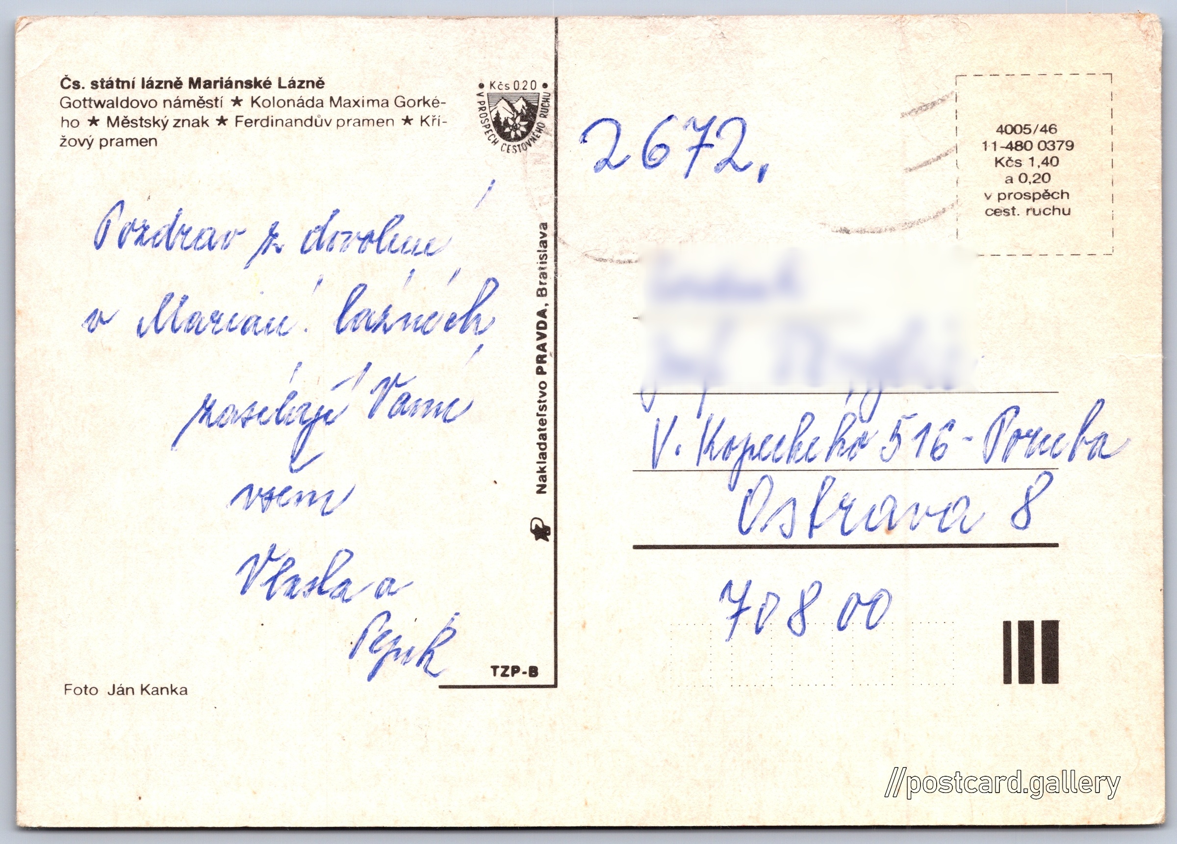 Mariánské Lázně Pokud chcete vidět pohlednice ve vyšším rozlišení nebo zobrazovat jejich zadní stranu, tak se prosím nejdříve přihlašte Přihlásit Zaregistrovat Mariánské Lázně Čs. státní lázně Mariánské Lázně- Gottwaldovo náměstí- Kolonáda Maxima Gorkého- Městský znak- Ferdinandův pramen- Křížový pramen Jazyk tištěného textu na pohlednici: čeština Mírové náměstí, Mariánské Lázně, Cheb ukázat na mapě Vydavatel: Nakladateľstvo PRAVDA, Bratislava (Československo) Rok vydání pohlednice: březen, 1979 Velikost (š x v) a tvar pohlednice: 147 x 104 mm (5.79" x 4.09"), obdélník Osoby spjaté s touto pohlednicí: Klement Gottwald(Jméno v názvu místa) Ján Kanka(Autor fotografie) Maxim Gorkij(Jméno v názvu místa) Prošlá poštou Ceny: Cena pohlednice: 1,40 Kčs (CSK) (+0,20 Kčs přípl. na tur. ruch) Kódy na pohlednici: 4005/46 11-480 0379 DiskuseVložit příspěvek Přidat novou složku ... Spravovat složky ...