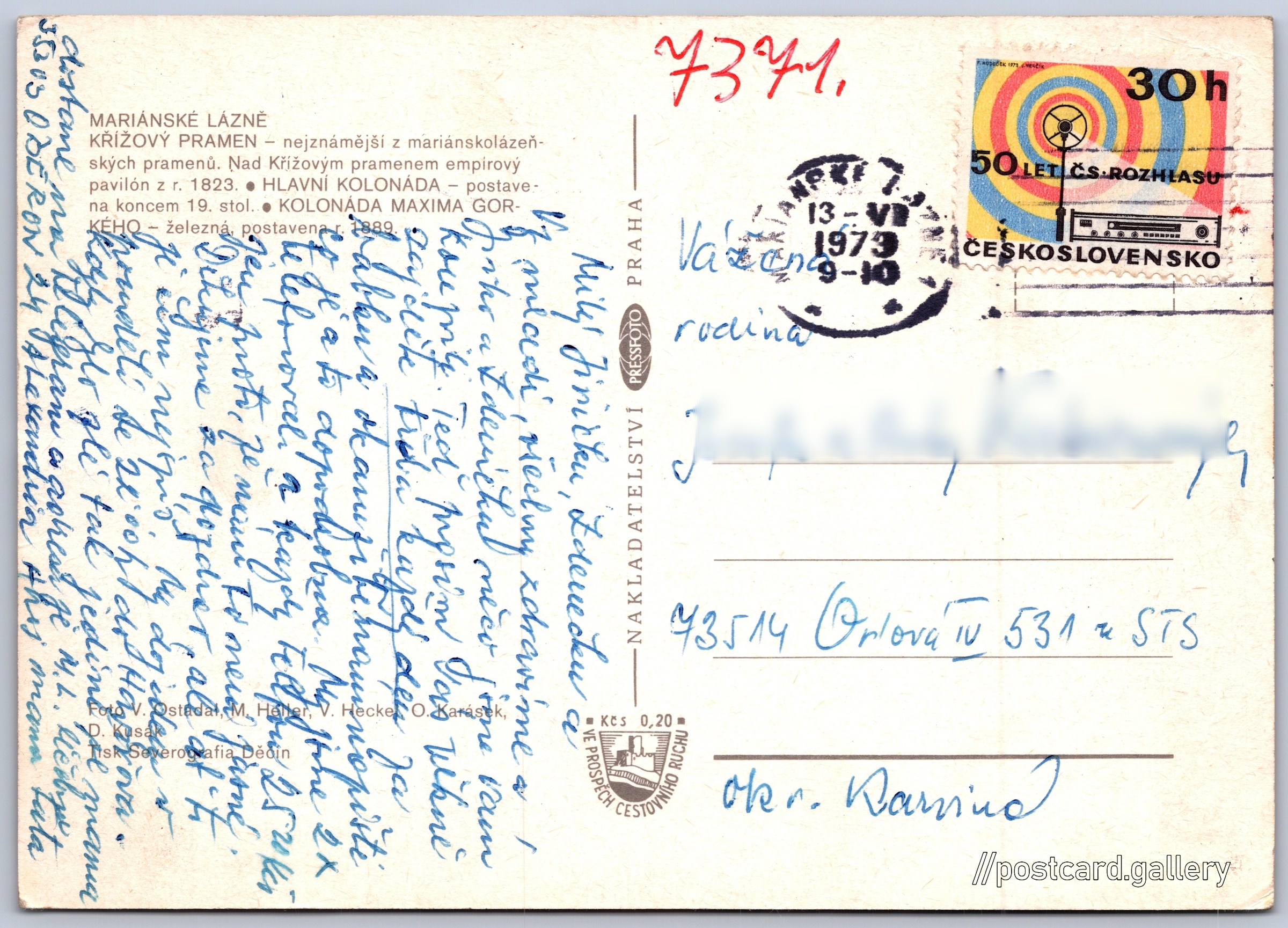 Mariánské Lázně Pokud chcete vidět pohlednice ve vyšším rozlišení nebo zobrazovat jejich zadní stranu, tak se prosím nejdříve přihlašte Přihlásit Zaregistrovat Mariánské Lázně MARIÁNSKÉ LÁZNĚ- KŘÍŽOVÝ PRAMEN - nejznámější z mariánskolázeňských pramenů. Nad Křížovým pramenem empírový pavilón z r. 1823.- HLAVNÍ KOLONÁDA - postavena koncem 19. stol.- KOLONÁDA MAXIMA GORKÉHO - železná, postavena r. 1889 Jazyk tištěného textu na pohlednici: čeština Mariánské Lázně, Cheb ukázat na mapě Vydavatel: PressFoto Praha (Československo) Odhadované datum vydání pohlednice: 1970 - 1973 Pomozte nám zpřesnit rok vzniku pohlednice Velikost (š x v) a tvar pohlednice: 148 x 105 mm (5.83" x 4.13"), obdélník Osoby spjaté s touto pohlednicí: Dalibor Kusák(Autor fotografie) Václav Ostádal(Autor fotografie) Vilém Heckel(Autor fotografie) Oldřich Karásek(Autor fotografie) M. Heller(Autor fotografie) Prošlá poštou:Datum na razítku: 13.7.1973 Ceny: Příplatek na tur. ruch: 0,20 Kčs (CSK))Vyplacené známky: 0,30 Kčs (CSK) DiskuseVložit příspěvek Přidat novou složku ... Spravovat složky ...