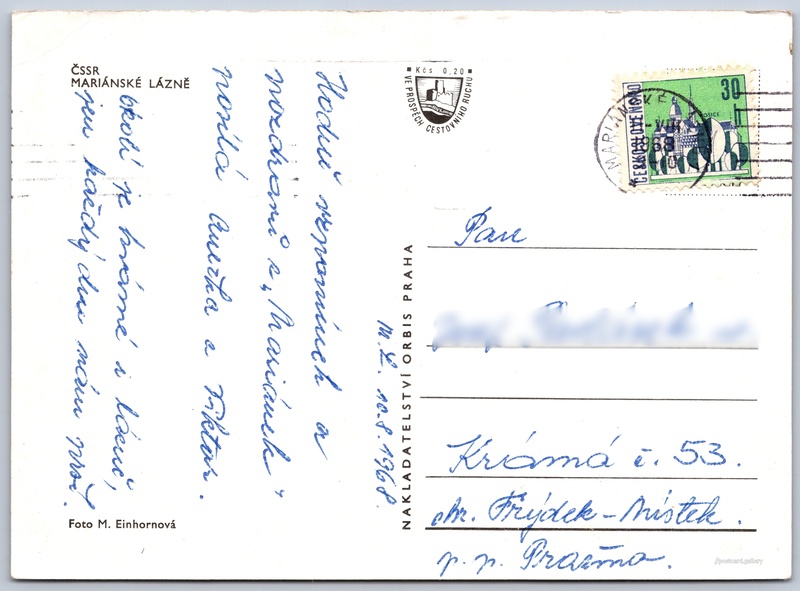 Mariánské Lázně 3/4 Pokud chcete vidět pohlednice ve vyšším rozlišení nebo zobrazovat jejich zadní stranu, tak se prosím nejdříve přihlašte Přihlásit Zaregistrovat Mariánské Lázně ČSSRMARIÁNSKÉ LÁZNĚ Jazyk tištěného textu na pohlednici: čeština Vrchlického 86/1, Mariánské Lázně, 353 01, Cheb ukázat na mapě Vydavatel: Nakladatelství Orbis (Československo) Odhadované datum vydání pohlednice: 1965 - 1968 Pomozte nám zpřesnit rok vzniku pohlednice Velikost (š x v) a tvar pohlednice: 147 x 107 mm (5.79" x 4.21"), obdélník Osoby spjaté s touto pohlednicí: Milada Einhornová(Autor fotografie) Prošlá poštou:Datum na razítku: 11.8.1968Datum napsání pohledu: 10.8.1968 Ceny: Příplatek na tur. ruch: 0,20 Kčs (CSK))Vyplacené známky: 0,30 Kčs (CSK) DiskuseVložit příspěvek Přidat novou složku ... Spravovat složky ...