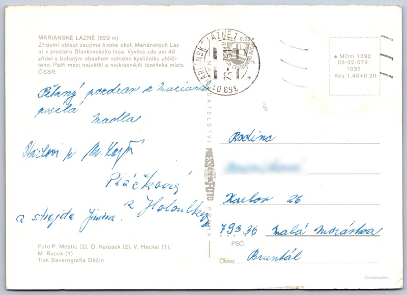 Mariánské Lázně Pokud chcete vidět pohlednice ve vyšším rozlišení nebo zobrazovat jejich zadní stranu, tak se prosím nejdříve přihlašte Přihlásit Zaregistrovat Mariánské Lázně MARIÁNSKÉ LÁZNĚ (629 m)Zřídelní oblast zaujímá široké okolí Mariánských Lázní v prostoru Slavkovského lesa. Vyvěrá zde asi 40 zřídel s bohatým obsahem volného kysličníku uhličitého. Patří mezi největší a nejkrásnější lázeňská místa ČSSR. Jazyk tištěného textu na pohlednici: čeština Mariánské Lázně 591, Mariánské Lázně, 353 01, Cheb ukázat na mapě Vydavatel: PressFoto Praha (Československo) Rok vydání pohlednice: 1975 Velikost (š x v) a tvar pohlednice: 148 x 106 mm (5.83" x 4.17"), obdélník Osoby spjaté s touto pohlednicí: Milan Racek(Autor fotografie) Petr Mestic(Autor fotografie) Vilém Heckel(Autor fotografie) Oldřich Karásek(Autor fotografie) Prošlá poštou Ceny: Cena pohlednice: 1,40 Kčs (CSK) (+0,20 Kčs přípl. na tur. ruch) Kódy na pohlednici: •MOm 1692 03-02-579 1037 DiskuseVložit příspěvek Přidat novou složku ... Spravovat složky ...