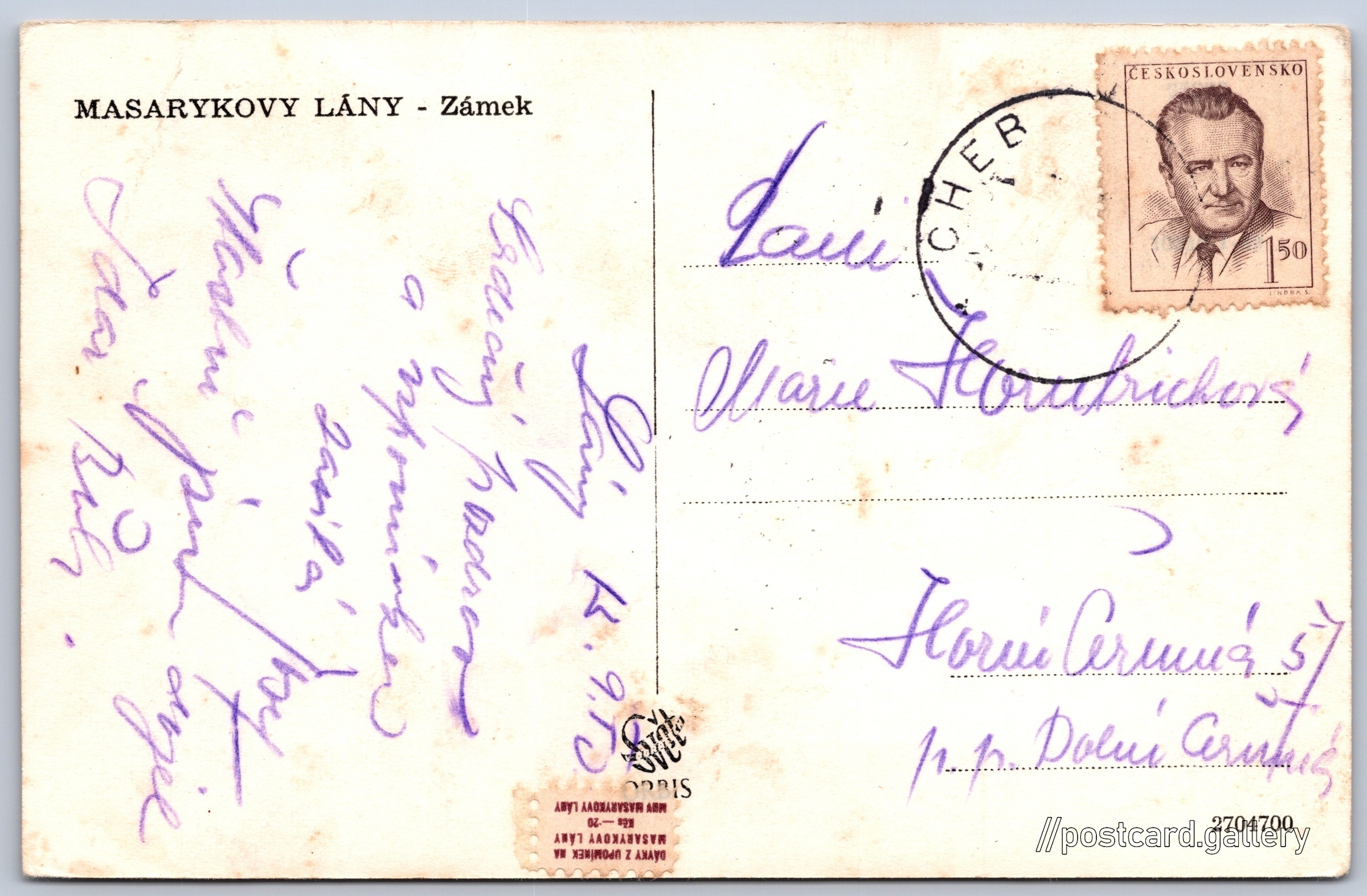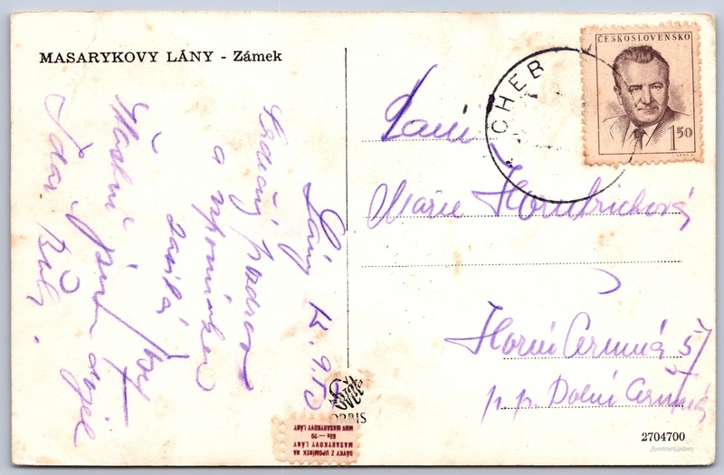 Masarykovy Lány, zámek Pokud chcete vidět pohlednice ve vyšším rozlišení nebo zobrazovat jejich zadní stranu, tak se prosím nejdříve přihlašte Přihlásit Zaregistrovat MASARYKOVY LÁNY - Zámek Jazyk tištěného textu na pohlednici: čeština Zámecká 2, Lány, 270 61, Kladno ukázat na mapě V blízkém okolí místa zobrazeného na pohlednici lze najít 2 jiné pohlednice. Zobrazit blízké pohlednice Vydavatel: Nakladatelství Orbis (Československo) Odhadované datum vydání pohlednice: 1947 - 1948 Pomozte nám zpřesnit rok vzniku pohlednice Velikost (š x v) a tvar pohlednice: 138 x 90 mm (5.43" x 3.54"), obdélník Osoby spjaté s touto pohlednicí: Tomáš Garrigue Masaryk(Obsah pohlednice) Prošlá poštou:Datum napsání pohledu: 13.9.1950 Ceny: Příplatek na tur. ruch: 0,20 Kčs (CSK))Vyplacené známky: 1,50 Kčs (CSK) Kódy na pohlednici: 2704700 DiskuseVložit příspěvek Přidat novou složku ... Spravovat složky ...
