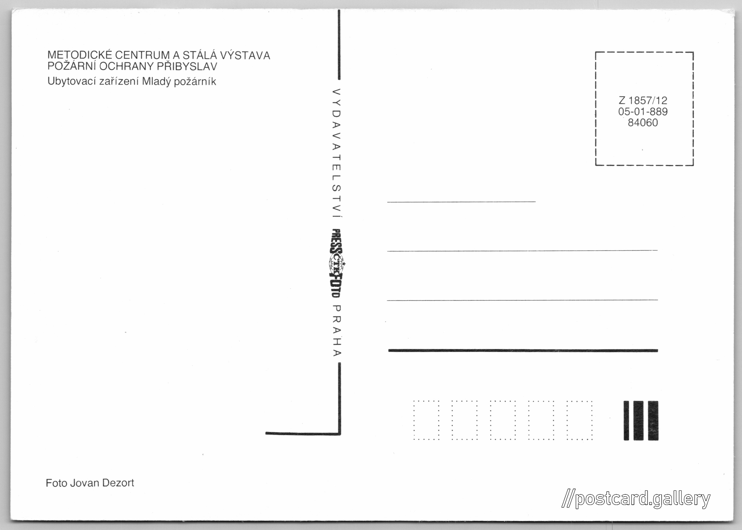 Metodické centrum požární ochrany Přibyslav Pokud chcete vidět pohlednice ve vyšším rozlišení nebo zobrazovat jejich zadní stranu, tak se prosím nejdříve přihlašte Přihlásit Zaregistrovat METODICKÉ CENTRUM A STÁLÁ VÝSTAVA POŽÁRNÍ OCHRANY PŘIBYSLAVUbytovací zařízení Mladý požárník Jazyk tištěného textu na pohlednici: čeština Hotel Přibyslav, Husova 385, Přibyslav, Kraj Vysočina, Česko ukázat na mapě V blízkém okolí místa zobrazeného na pohlednici lze najít 2 jiné pohlednice. Zobrazit blízké pohlednice Vydavatel: PressFoto Praha (Československo) Rok vydání pohlednice: 1988 Velikost (š x v) a tvar pohlednice: 151 x 109 mm (5.94" x 4.29"), obdélník Osoby spjaté s touto pohlednicí: Jovan Dezort(Autor fotografie) Čistá pohlednice (neprošlá poštou) Kódy na pohlednici: Z 1857/12 05-01-889 84060 DiskuseVložit příspěvek Přidat novou složku ... Spravovat složky ...
