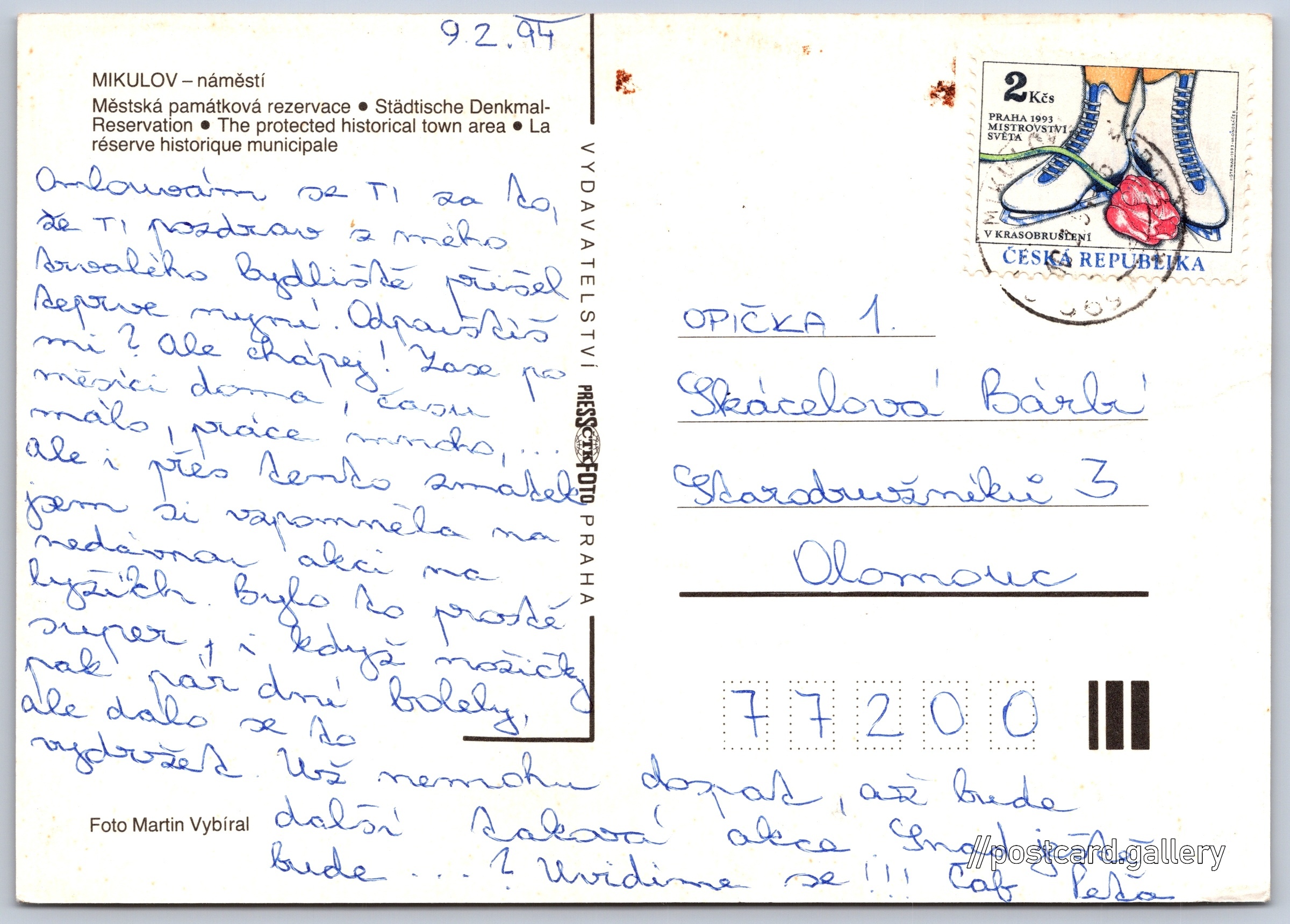 Mikulov, náměstí Pokud chcete vidět pohlednice ve vyšším rozlišení nebo zobrazovat jejich zadní stranu, tak se prosím nejdříve přihlašte Přihlásit Zaregistrovat Mikulov MIKULOV - náměstí- Městská památková rezervace- Städtische Denkmal-Reservation- The protected historical town area- La réserve historique municipale Jazyk tištěného textu na pohlednici: čeština Náměstí, Mikulov, Břeclav ukázat na mapě V blízkém okolí místa zobrazeného na pohlednici lze najít 2 jiné pohlednice. Zobrazit blízké pohlednice Vydavatel: PressFoto Praha (Československo) Odhadované datum vydání pohlednice: 1991 - 1994 Pomozte nám zpřesnit rok vzniku pohlednice Velikost (š x v) a tvar pohlednice: 147 x 105 mm (5.79" x 4.13"), obdélník Osoby spjaté s touto pohlednicí: Martin Vybíral(Autor fotografie) Prošlá poštou:Datum na razítku: 9.2.1994Datum napsání pohledu: 9.2.1994 Ceny: Vyplacené známky: 2,00 Kč (CZK) DiskuseVložit příspěvek Přidat novou složku ... Spravovat složky ...