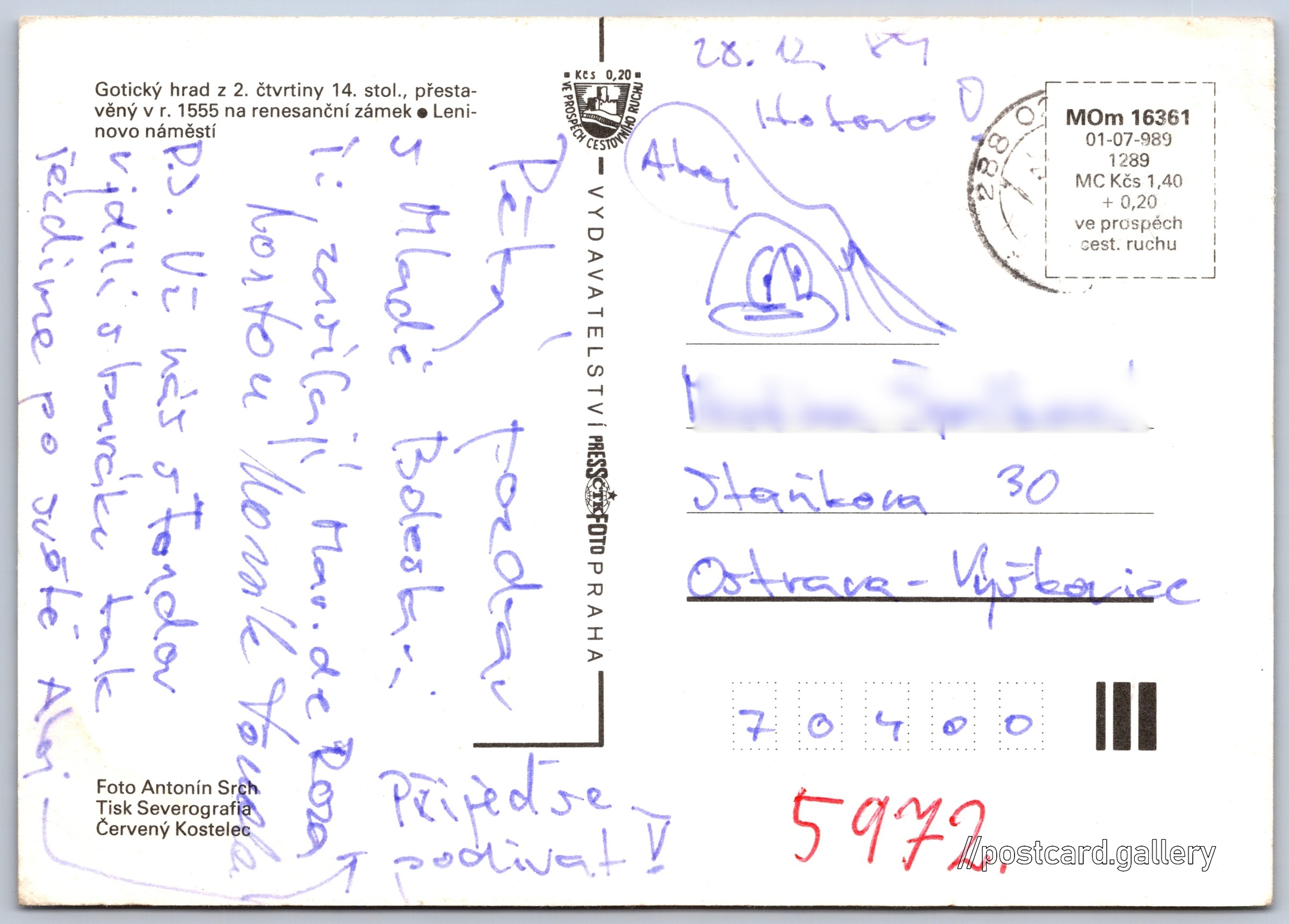Mladá Boleslav Pokud chcete vidět pohlednice ve vyšším rozlišení nebo zobrazovat jejich zadní stranu, tak se prosím nejdříve přihlašte Přihlásit Zaregistrovat Mladá Boleslav - Gotický hrad z 2. čtvrtiny 14. stol., přestavěný v r. 1555 na renesanční zámek- Leninovo náměstí Jazyk tištěného textu na pohlednici: čeština Staroměstské náměstí 1/55, Mladá Boleslav, 293 01, Mladá Boleslav ukázat na mapě Vydavatel: PressFoto Praha (Československo) Rok vydání pohlednice: 1989 Velikost (š x v) a tvar pohlednice: 148 x 105 mm (5.83" x 4.13"), obdélník Osoby spjaté s touto pohlednicí: V. I. Lenin(Jméno v názvu místa) Antonín Srch(Autor fotografie) Prošlá poštou:Datum napsání pohledu: 28.12.1989 Ceny: Cena pohlednice: 1,40 Kčs (CSK) (+0,20 Kčs přípl. na tur. ruch) Kódy na pohlednici: MOm 16361 01-07-989 1289 DiskuseVložit příspěvek Přidat novou složku ... Spravovat složky ...