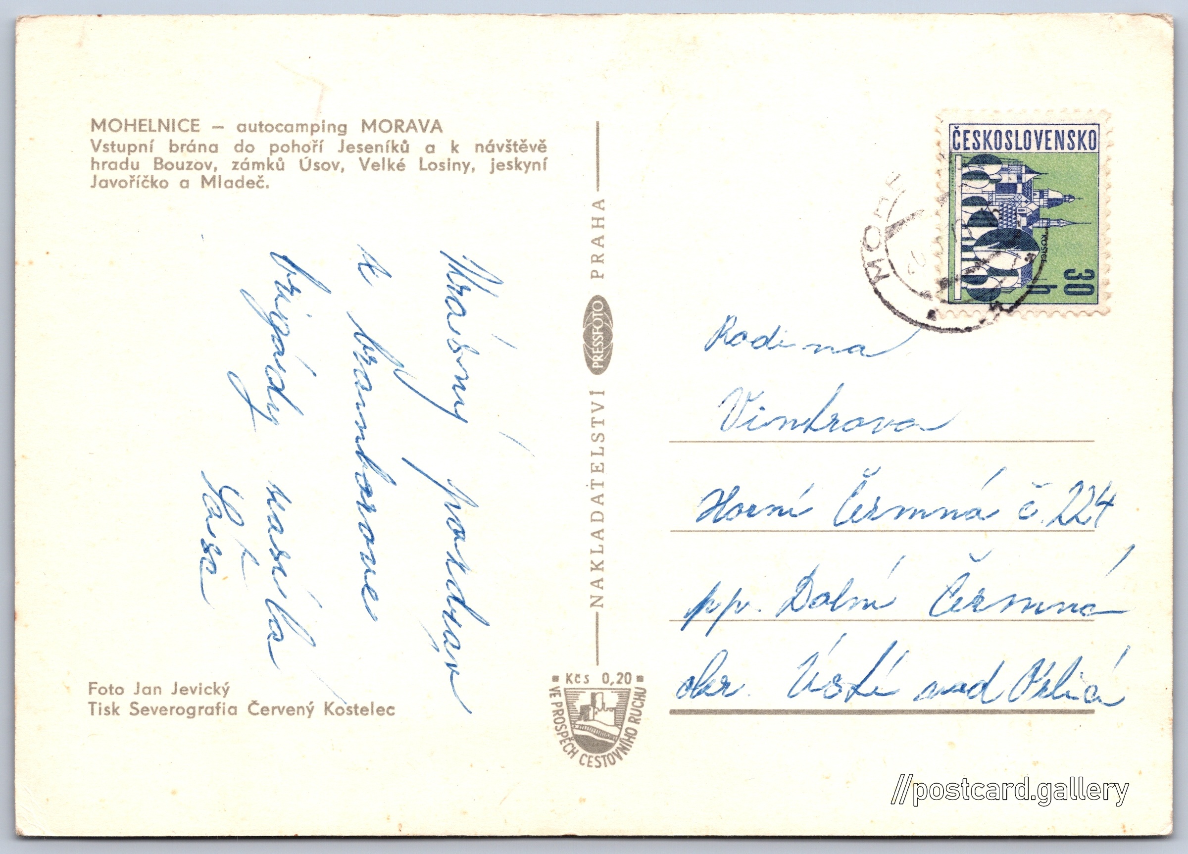 Mohelnice, autocamp Morava Pokud chcete vidět pohlednice ve vyšším rozlišení nebo zobrazovat jejich zadní stranu, tak se prosím nejdříve přihlašte Přihlásit Zaregistrovat MOHELNICE - autocamping MORAVAVstupní brána do pohoří Jeseníků a k návštěvě hradu Bouzov, zámků Úsov, Velké Losiny, jeskyní Javoříčko a Mladeč. Jazyk tištěného textu na pohlednici: čeština MoravaCamp Hotel & Campsite, Petra Bezruče 795/13, Mohelnice, Olomoucký kraj, Česko ukázat na mapě V blízkém okolí místa zobrazeného na pohlednici lze najít 2 jiné pohlednice. Zobrazit blízké pohlednice Vydavatel: PressFoto Praha (Československo) Datum vydání není známo Pomozte nám odhadnout datum vzniku pohlednice Velikost (š x v) a tvar pohlednice: 148 x 105 mm (5.83" x 4.13"), obdélník Osoby spjaté s touto pohlednicí: Jan Jevický(Autor fotografie) Prošlá poštou Ceny: Příplatek na tur. ruch: 0,20 Kčs (CSK))Vyplacené známky: 0,30 Kčs (CSK) DiskuseVložit příspěvek Přidat novou složku ... Spravovat složky ...