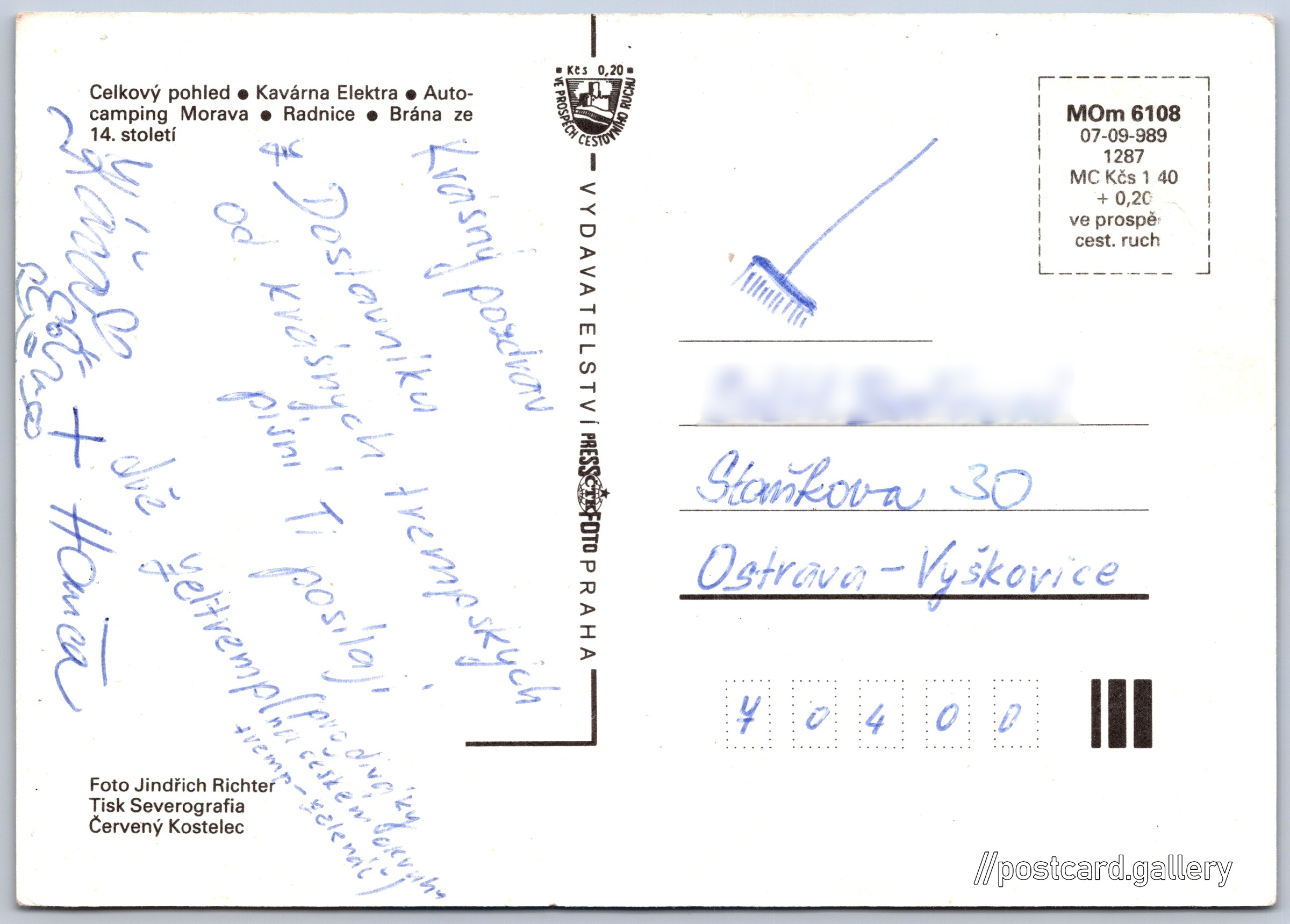 Mohelnice 1/2 Pokud chcete vidět pohlednice ve vyšším rozlišení nebo zobrazovat jejich zadní stranu, tak se prosím nejdříve přihlašte Přihlásit Zaregistrovat Mohelnice - Celkový pohled- Kavárna Elektra- Autocamping Morava- Radnice- Brána ze 14. století Jazyk tištěného textu na pohlednici: čeština Mohelnice, Město, Olomoucký kraj, Česko ukázat na mapě V blízkém okolí místa zobrazeného na pohlednici lze najít 2 jiné pohlednice. Zobrazit blízké pohlednice Vydavatel: PressFoto Praha (Československo) Rok vydání pohlednice: 1989 Velikost (š x v) a tvar pohlednice: 148 x 105 mm (5.83" x 4.13"), obdélník Osoby spjaté s touto pohlednicí: Jindřich Richter(Autor fotografie) Prošlá poštou Ceny: Cena pohlednice: 1,40 Kčs (CSK) (+0,20 Kčs přípl. na tur. ruch) Kódy na pohlednici: MOm 6108 07-09-989 1287 DiskuseVložit příspěvek Přidat novou složku ... Spravovat složky ...