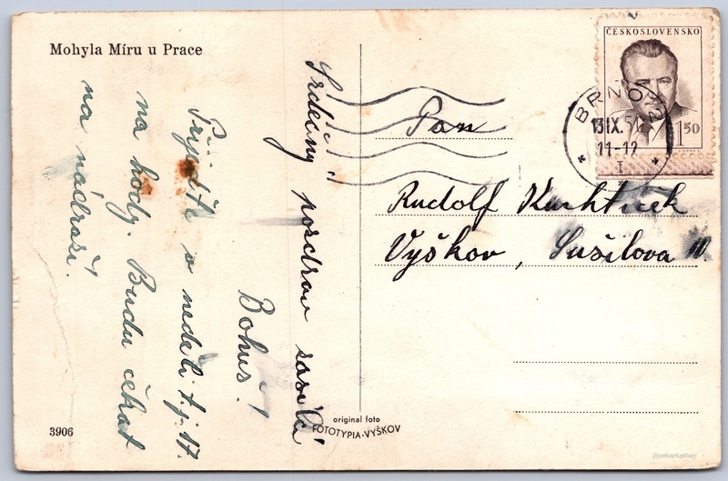 Mohyla míru u Prace 2/3 Pokud chcete vidět pohlednice ve vyšším rozlišení nebo zobrazovat jejich zadní stranu, tak se prosím nejdříve přihlašte Přihlásit Zaregistrovat Mohyla Míru u Prace Jazyk tištěného textu na pohlednici: čeština K Mohyle míru 200, 664 58 Prace, Czechia ukázat na mapě V blízkém okolí místa zobrazeného na pohlednici lze najít 3 jiné pohlednice. Zobrazit blízké pohlednice Vydavatel: Fototypia - Vyškov (Československo) Odhadované datum vydání pohlednice: 1947 - 1950 Pomozte nám zpřesnit rok vzniku pohlednice Velikost (š x v) a tvar pohlednice: 137 x 90 mm (5.39" x 3.54"), obdélník Prošlá poštou:Datum na razítku: 13.9.1950 Ceny: Vyplacené známky: 1,50 Kčs (CSK) Kódy na pohlednici: 3906 DiskuseVložit příspěvek Přidat novou složku ... Spravovat složky ...