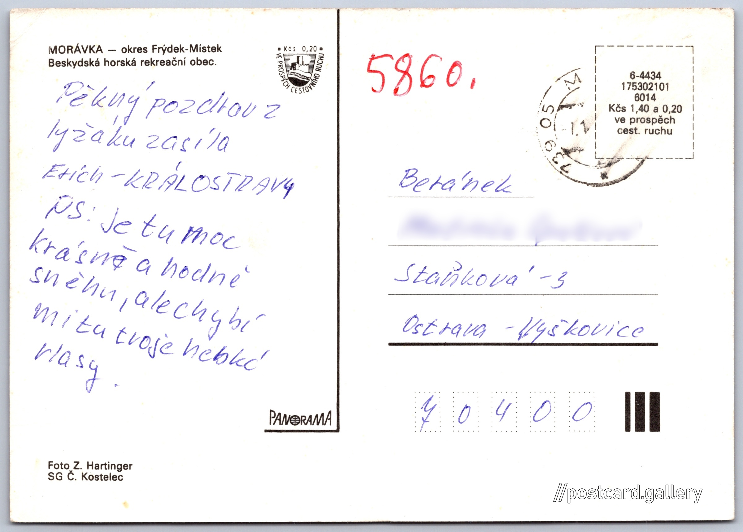 Morávka, okres Frýdek - Místek Pokud chcete vidět pohlednice ve vyšším rozlišení nebo zobrazovat jejich zadní stranu, tak se prosím nejdříve přihlašte Přihlásit Zaregistrovat Morávka MORÁVKA - okres Frýdek-MístekBeskydská horská rekreační obec. Jazyk tištěného textu na pohlednici: čeština Morávka, Obec, Česko ukázat na mapě Vydavatel: Panorama (Československo) Datum vydání není známo Pomozte nám odhadnout datum vzniku pohlednice Velikost (š x v) a tvar pohlednice: 147 x 105 mm (5.79" x 4.13"), obdélník Osoby spjaté s touto pohlednicí: Zd. Hartinger(Autor fotografie) Prošlá poštou Ceny: Cena pohlednice: 1,40 Kčs (CSK) (+0,20 Kčs přípl. na tur. ruch) Kódy na pohlednici: 6-4434 175302101 6014 DiskuseVložit příspěvek Přidat novou složku ... Spravovat složky ...