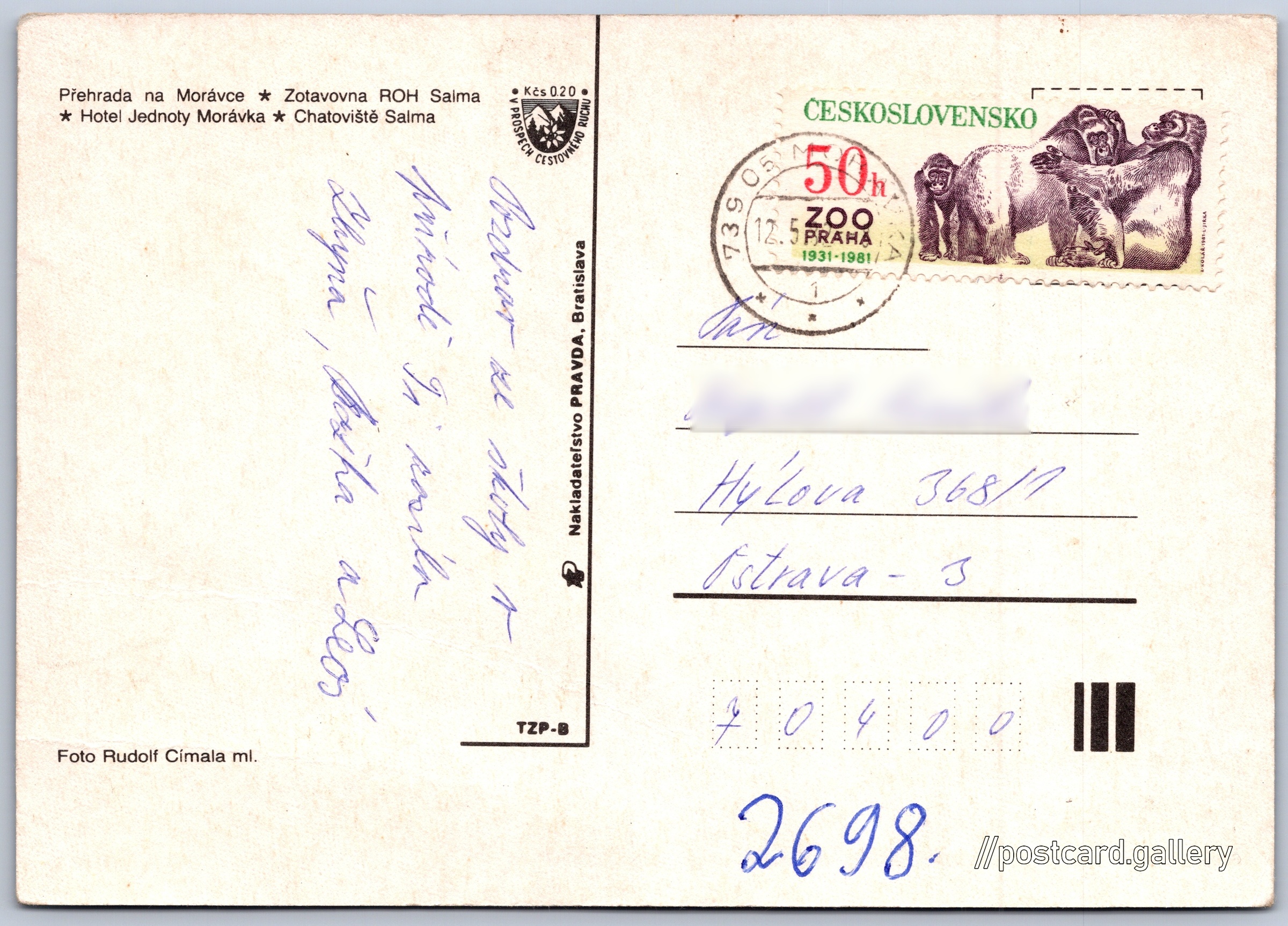 Morávka Pokud chcete vidět pohlednice ve vyšším rozlišení nebo zobrazovat jejich zadní stranu, tak se prosím nejdříve přihlašte Přihlásit Zaregistrovat Morávka - Přehrada na Morávce- Zotavovna ROH Salma- Hotel Jednoty Morávka- Chatoviště Salma Jazyk tištěného textu na pohlednici: čeština Vodní nádrž Morávka, Vodárenská nádrž, Morávka, Česko ukázat na mapě Vydavatel: Nakladateľstvo PRAVDA, Bratislava (Československo) Odhadované datum vydání pohlednice: 1979 - 1982 Pomozte nám zpřesnit rok vzniku pohlednice Velikost (š x v) a tvar pohlednice: 149 x 105 mm (5.87" x 4.13"), obdélník Osoby spjaté s touto pohlednicí: Rudolf Címala ml.(Autor fotografie) Prošlá poštou:Datum na razítku: 12.5.1982 Ceny: Příplatek na tur. ruch: 0,20 Kčs (CSK))Vyplacené známky: 0,50 Kčs (CSK) DiskuseVložit příspěvek Přidat novou složku ... Spravovat složky ...