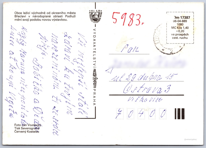 Moravská Nová Ves, Hrušky, Týnec Pokud chcete vidět pohlednice ve vyšším rozlišení nebo zobrazovat jejich zadní stranu, tak se prosím nejdříve přihlašte Přihlásit Zaregistrovat Moravská Nová Ves, Hrušky, Týnec Obce ležící východně od okresního města Břeclavi v národopisné oblasti Podluží mění svoji podobu novou výstavbou. Jazyk tištěného textu na pohlednici: čeština Moravská Nová Ves, Břeclav ukázat na mapě V blízkém okolí místa zobrazeného na pohlednici lze najít 1 jinou pohlednici. Zobrazit blízké pohlednice Vydavatel: PressFoto Praha (Československo) Rok vydání pohlednice: 1988 Velikost (š x v) a tvar pohlednice: 148 x 105 mm (5.83" x 4.13"), obdélník Osoby spjaté s touto pohlednicí: Jan Vozdecký(Autor fotografie) Prošlá poštou Ceny: Cena pohlednice: 1,40 Kčs (CSK) (+0,20 Kčs přípl. na tur. ruch) Kódy na pohlednici: Om 17387 06-04-889 1080 DiskuseVložit příspěvek Přidat novou složku ... Spravovat složky ...