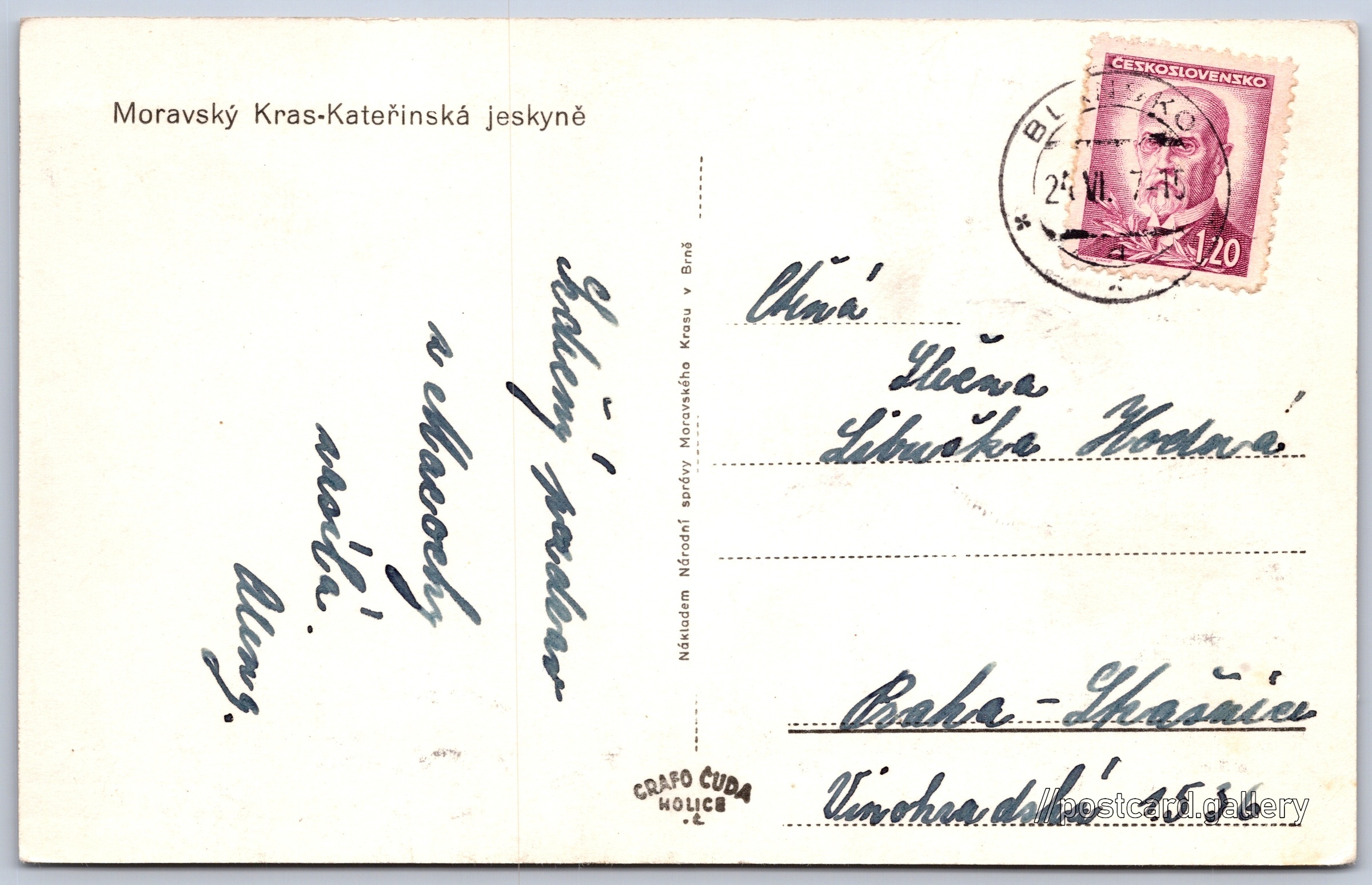 Moravský kras, Kateřinská jeskyně Pokud chcete vidět pohlednice ve vyšším rozlišení nebo zobrazovat jejich zadní stranu, tak se prosím nejdříve přihlašte Přihlásit Zaregistrovat Moravský Kras - Kateřinská jeskyně Jazyk tištěného textu na pohlednici: čeština Kateřinská jeskyně, Jeskyně, Vavřinec, Jihomoravský kraj, Česko ukázat na mapě V blízkém okolí místa zobrazeného na pohlednici lze najít 17 jiných pohlednic. Zobrazit blízké pohlednice Vydavatel: Grafo Čuda Holice (Československo)Národní správa Moravského Krasu (Československo) Odhadované datum vydání pohlednice: 1945 - 1947 Pomozte nám zpřesnit rok vzniku pohlednice Velikost (š x v) a tvar pohlednice: 139 x 88 mm (5.47" x 3.46"), obdélník Prošlá poštou:Datum na razítku: 24.6.1947 Ceny: Vyplacené známky: 1,20 Kčs (CSK) DiskuseVložit příspěvek Přidat novou složku ... Spravovat složky ...