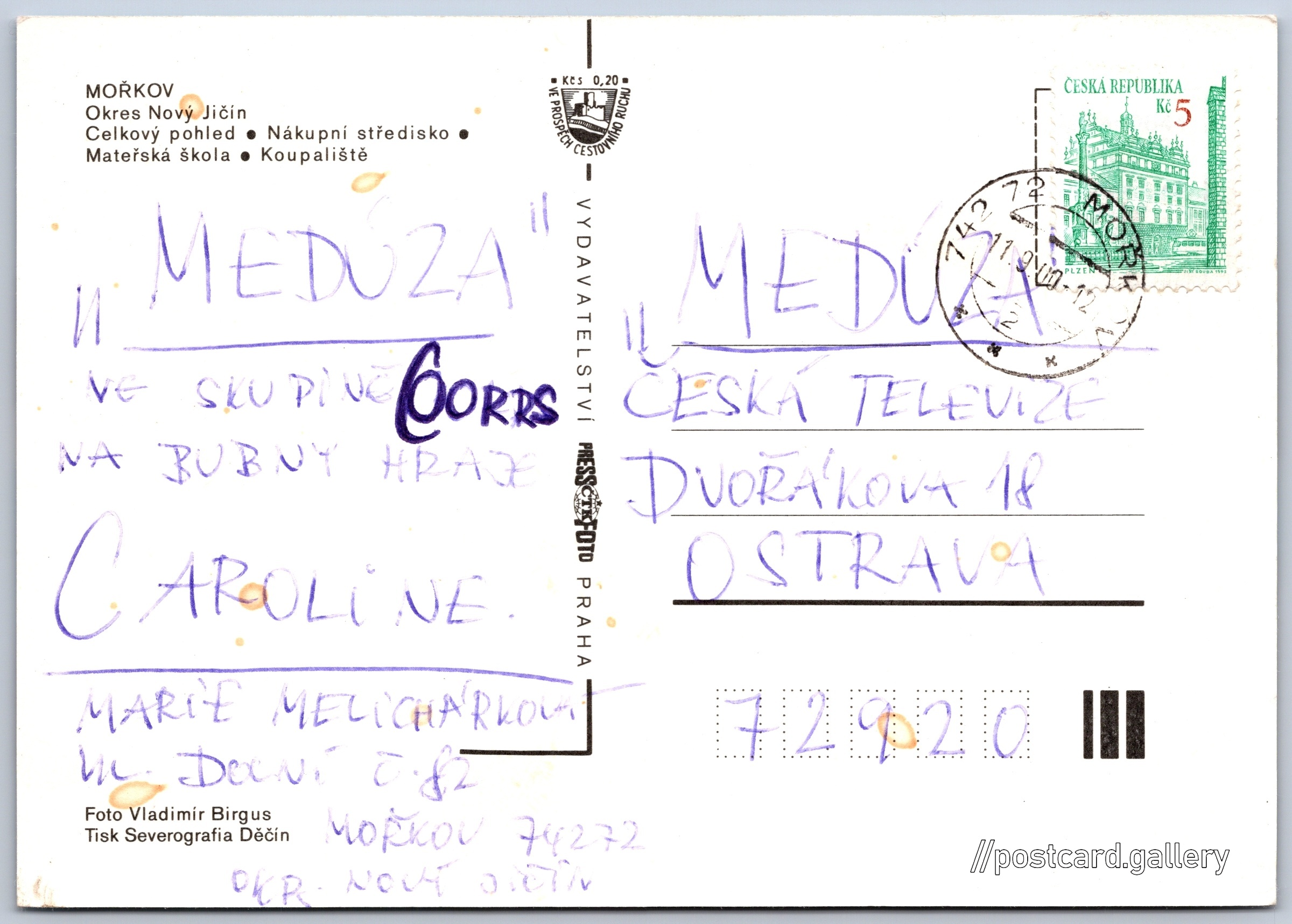 Mořkov Pokud chcete vidět pohlednice ve vyšším rozlišení nebo zobrazovat jejich zadní stranu, tak se prosím nejdříve přihlašte Přihlásit Zaregistrovat Mořkov MOŘKOVOkres Nový Jičín- Celkový pohled- Nákupní středisko- Mateřská škola- Koupaliště Jazyk tištěného textu na pohlednici: čeština Koupaliště Mořkov, Květná, Mořkov, Česko ukázat na mapě V blízkém okolí místa zobrazeného na pohlednici lze najít 1 jinou pohlednici. Zobrazit blízké pohlednice Vydavatel: PressFoto Praha (Československo) Odhadované datum vydání pohlednice: 1997 - 2000 Pomozte nám zpřesnit rok vzniku pohlednice Velikost (š x v) a tvar pohlednice: 148 x 104 mm (5.83" x 4.09"), obdélník Osoby spjaté s touto pohlednicí: Vladimír Birgus(Autor fotografie) Prošlá poštou:Datum na razítku: 11.9.2000 Ceny: Příplatek na tur. ruch: 0,20 Kčs (CSK))Vyplacené známky: 5,00 Kč (CZK) DiskuseVložit příspěvek Přidat novou složku ... Spravovat složky ...
