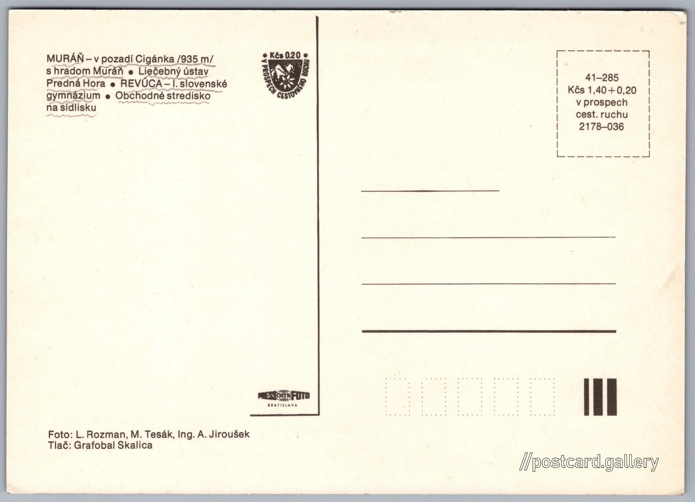 Muráň, Revúca 2/2 Pokud chcete vidět pohlednice ve vyšším rozlišení nebo zobrazovat jejich zadní stranu, tak se prosím nejdříve přihlašte Přihlásit Zaregistrovat Muráň, Revúca MURÁŇ- v pozadí Cigánka /935 m/ s hradom Muráň- Liečebný ústav Predná Hora- REVÚCA - 1. slovenské gymnázium- Obchodné stredisko na sídlisku Jazyk tištěného textu na pohlednici: slovenština Cigánka (935 m), Hora, výškový bod, Muráň, Slovensko ukázat na mapě V blízkém okolí místa zobrazeného na pohlednici lze najít 2 jiné pohlednice. Zobrazit blízké pohlednice Vydavatel: PressFoto Bratislava (Československo) Rok vydání pohlednice: 1978 Velikost (š x v) a tvar pohlednice: 147 x 105 mm (5.79" x 4.13"), obdélník Osoby spjaté s touto pohlednicí: Alexander Jiroušek(Autor fotografie) Ladislav Rozman(Autor fotografie) Milan Tesák(Autor fotografie) Čistá pohlednice (neprošlá poštou) Ceny: Cena pohlednice: 1,40 Kčs (CSK) (+0,20 Kčs přípl. na tur. ruch) Kódy na pohlednici: 41-285 2178-036 DiskuseVložit příspěvek Přidat novou složku ... Spravovat složky ...
