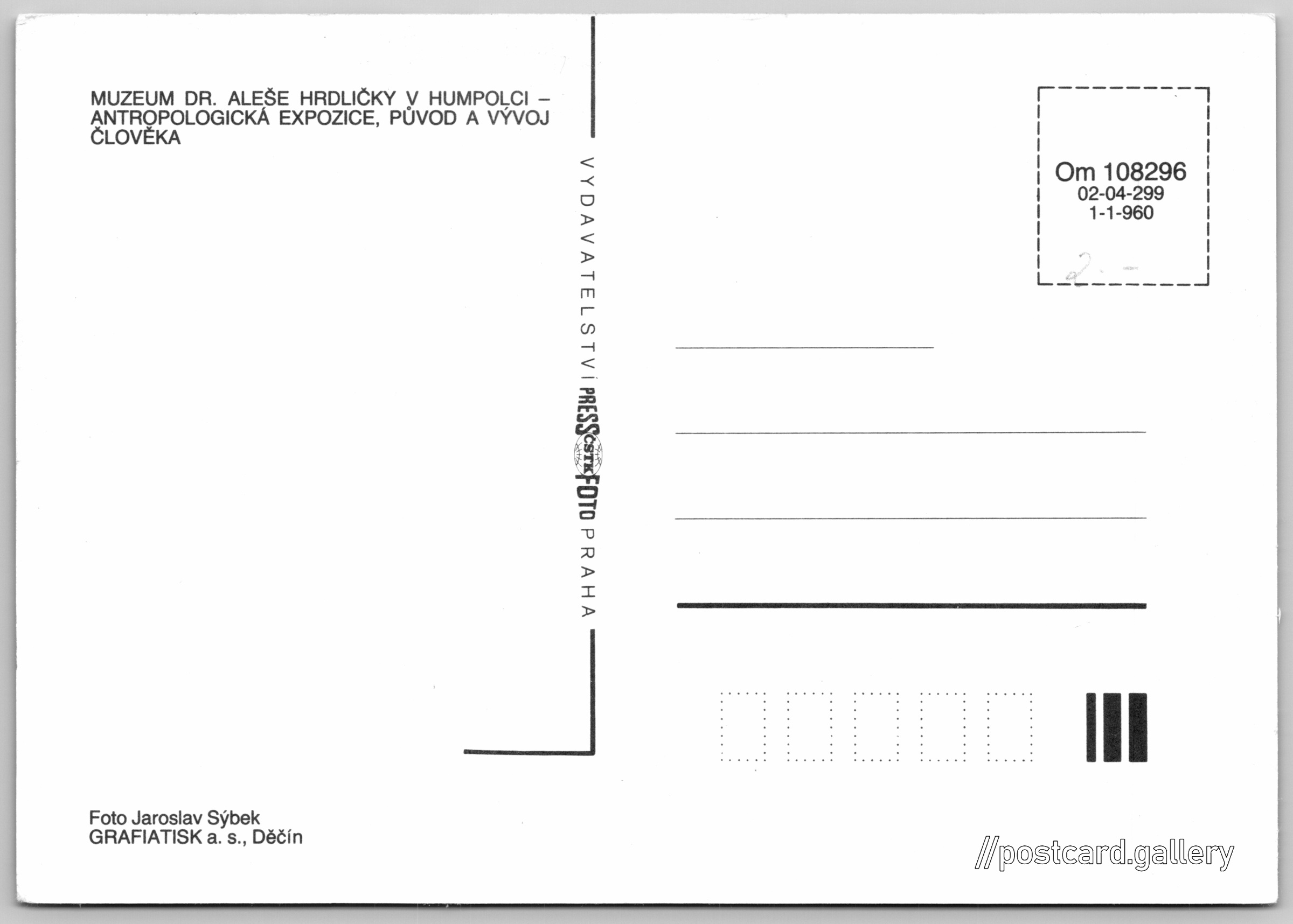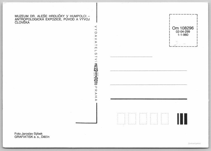 Muzeum Dr. Aleše Hrdličky v Humpolci 2/2 Pokud chcete vidět pohlednice ve vyšším rozlišení nebo zobrazovat jejich zadní stranu, tak se prosím nejdříve přihlašte Přihlásit Zaregistrovat MUZEUM DR. ALEŠE HRDLIČKÝ V HUMPOLCI - ANTROPOLOGICKÁ EXPOZICE, PŮVOD A VÝVOJ ČLOVĚKA Jazyk tištěného textu na pohlednici: čeština Muzeum Dr. Aleše Hrdličky, Muzeum, Horní náměstí 273, Humpolec, Česko ukázat na mapě Vydavatel: PressFoto Praha (Československo) Rok vydání pohlednice: 1992 Velikost (š x v) a tvar pohlednice: 148 x 104 mm (5.83" x 4.09"), obdélník Osoby spjaté s touto pohlednicí: Jaroslav Sýbek(Autor fotografie) Čistá pohlednice (neprošlá poštou) Kódy na pohlednici: Om 108296 02-04-299 1-1-960 DiskuseVložit příspěvek Přidat novou složku ... Spravovat složky ...