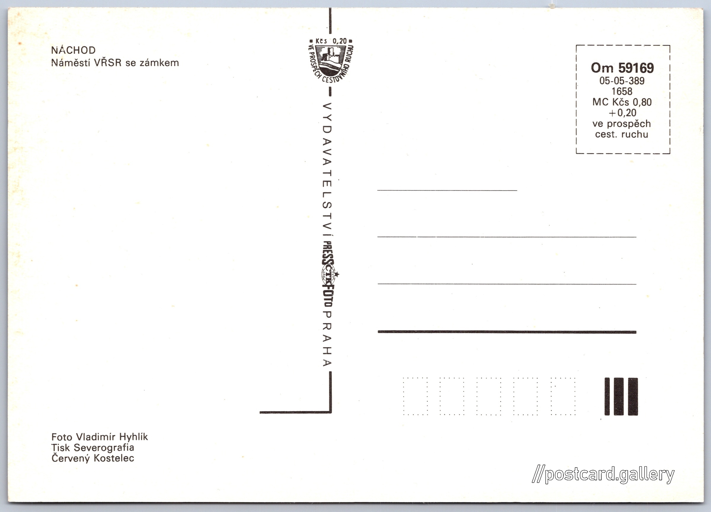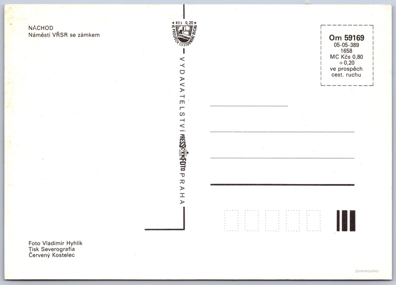 Náchod, Náměstí VŘSR se zámkem Pokud chcete vidět pohlednice ve vyšším rozlišení nebo zobrazovat jejich zadní stranu, tak se prosím nejdříve přihlašte Přihlásit Zaregistrovat NÁCHODNáměstí VŘSR se zámkem Jazyk tištěného textu na pohlednici: čeština Zámek Náchod, Zámek, Zámek 1282, Náchod, Česko ukázat na mapě V blízkém okolí místa zobrazeného na pohlednici lze najít 16 jiných pohlednic. Zobrazit blízké pohlednice Vydavatel: PressFoto Praha (Československo) Rok vydání pohlednice: 1983 Velikost (š x v) a tvar pohlednice: 148 x 105 mm (5.83" x 4.13"), obdélník Osoby spjaté s touto pohlednicí: Vladimír Hyhlík(Autor fotografie) Čistá pohlednice (neprošlá poštou) Ceny: Cena pohlednice: 0,80 Kčs (CSK) (+0,20 Kčs přípl. na tur. ruch) Kódy na pohlednici: Om 59169 05-05-389 1658 DiskuseVložit příspěvek Přidat novou složku ... Spravovat složky ...
