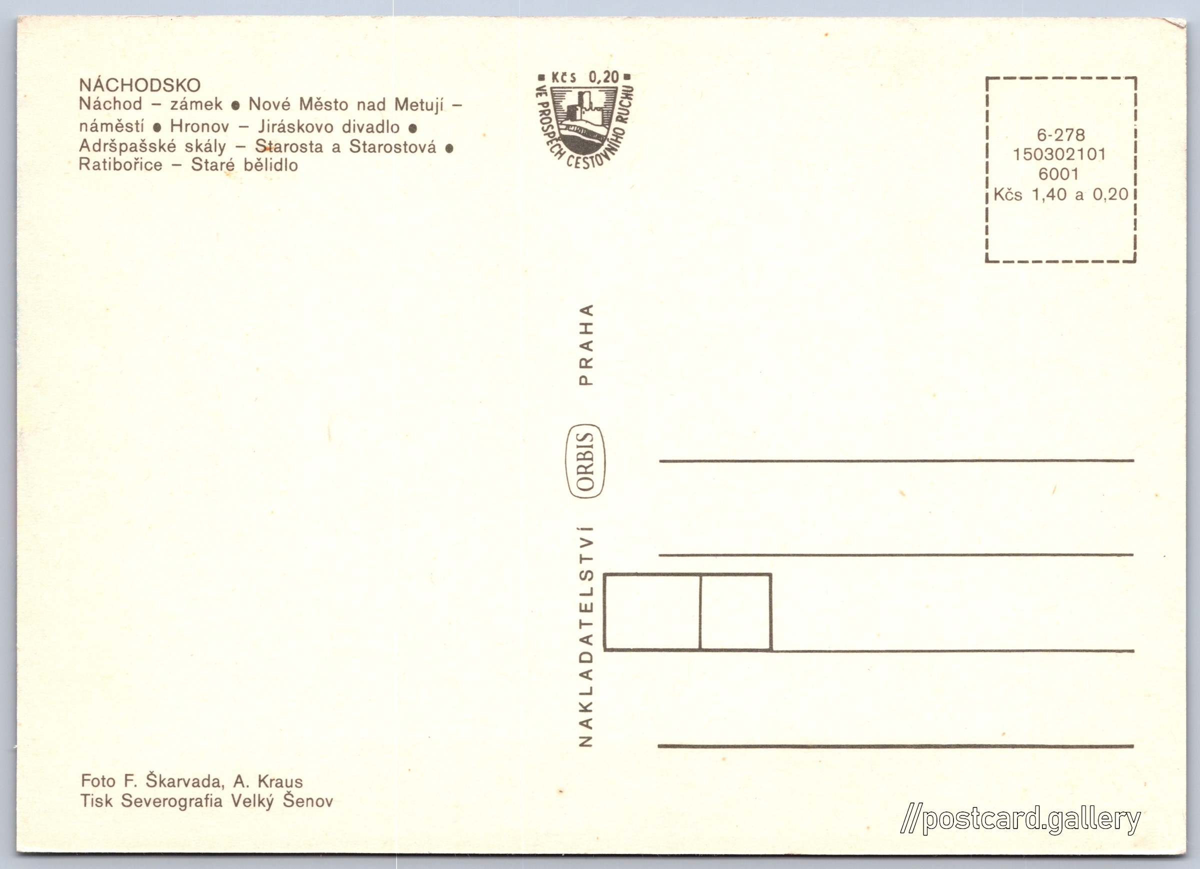 Náchodsko Pokud chcete vidět pohlednice ve vyšším rozlišení nebo zobrazovat jejich zadní stranu, tak se prosím nejdříve přihlašte Přihlásit Zaregistrovat Náchodsko NÁCHODSKO- Náchod - zámek- Nové Město nad Metují - náměstí- Hronov - Jiráskovo divadlo- Adršpašské skály - Starosta a Starostová- Ratibořice Staré bělidlo Jazyk tištěného textu na pohlednici: čeština Zámek Náchod, Zámek, Zámek 1282, Náchod, Česko ukázat na mapě V blízkém okolí místa zobrazeného na pohlednici lze najít 47 jiných pohlednic. Zobrazit blízké pohlednice Vydavatel: Nakladatelství Orbis (Československo) Datum vydání není známo Pomozte nám odhadnout datum vzniku pohlednice Velikost (š x v) a tvar pohlednice: 147 x 105 mm (5.79" x 4.13"), obdélník Osoby spjaté s touto pohlednicí: A. Kraus(Autor fotografie) Fr. Škarvada(Autor fotografie) Čistá pohlednice (neprošlá poštou) Ceny: Cena pohlednice: 1,40 Kčs (CSK) (+0,20 Kčs přípl. na tur. ruch) Kódy na pohlednici: 6-278 150302101 6001 DiskuseVložit příspěvek Přidat novou složku ... Spravovat složky ...