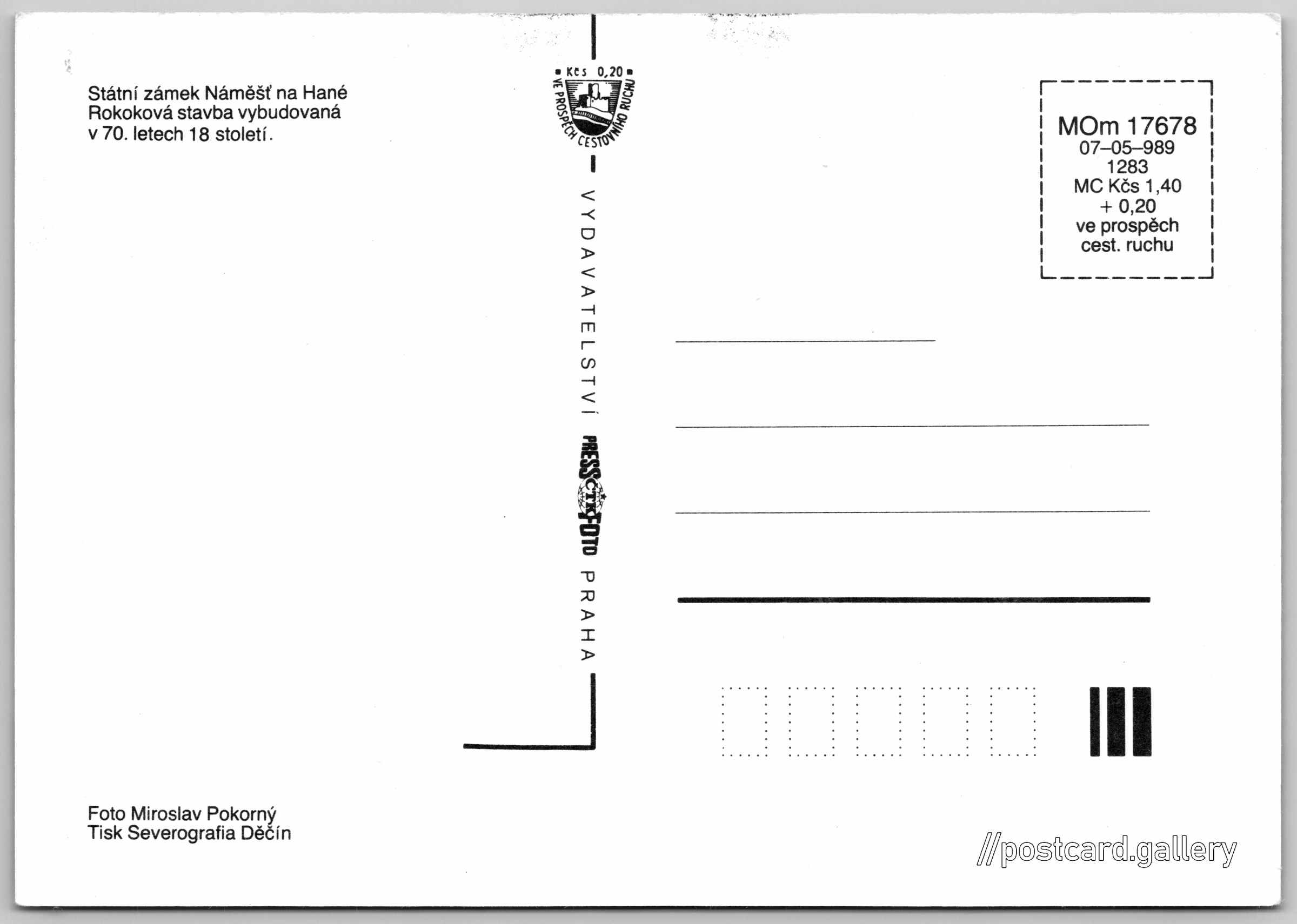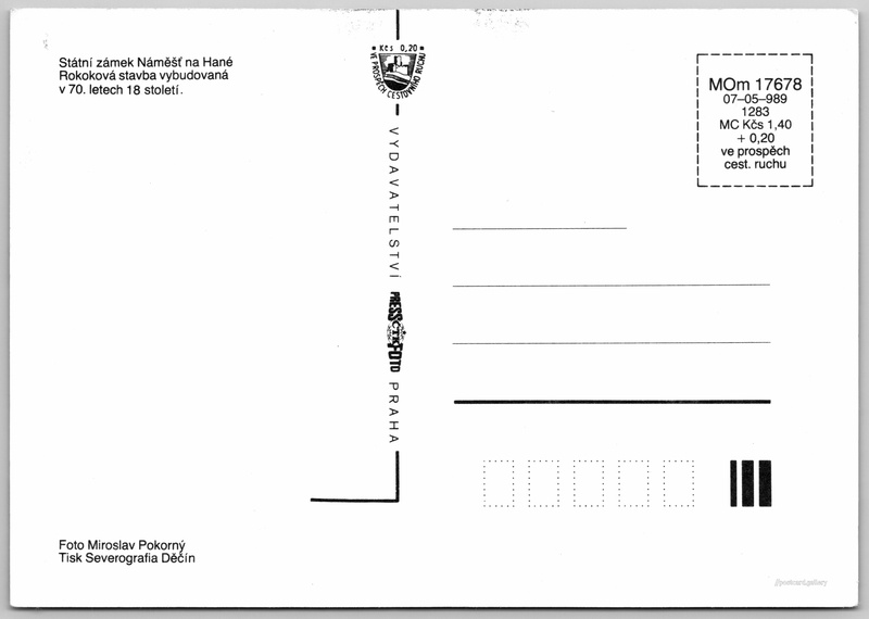 Náměšť na Hané, zámek Pokud chcete vidět pohlednice ve vyšším rozlišení nebo zobrazovat jejich zadní stranu, tak se prosím nejdříve přihlašte Přihlásit Zaregistrovat Náměšť na Hané Státní zámek Náměšť na HanéRokoková stavba vybudovaná v 70. letech 18. století. Jazyk tištěného textu na pohlednici: čeština Hrad 1, 783 44 Náměšť na Hané, Czechia ukázat na mapě V blízkém okolí místa zobrazeného na pohlednici lze najít 2 jiné pohlednice. Zobrazit blízké pohlednice Vydavatel: PressFoto Praha (Československo) Rok vydání pohlednice: 1989 Velikost (š x v) a tvar pohlednice: 148 x 105 mm (5.83" x 4.13"), obdélník Osoby spjaté s touto pohlednicí: Miroslav Pokorný(Autor fotografie) Čistá pohlednice (neprošlá poštou) Ceny: Cena pohlednice: 1,40 Kčs (CSK) (+0,20 Kčs přípl. na tur. ruch) Kódy na pohlednici: MOm 17678 07-05-989 1283 DiskuseVložit příspěvek Přidat novou složku ... Spravovat složky ...