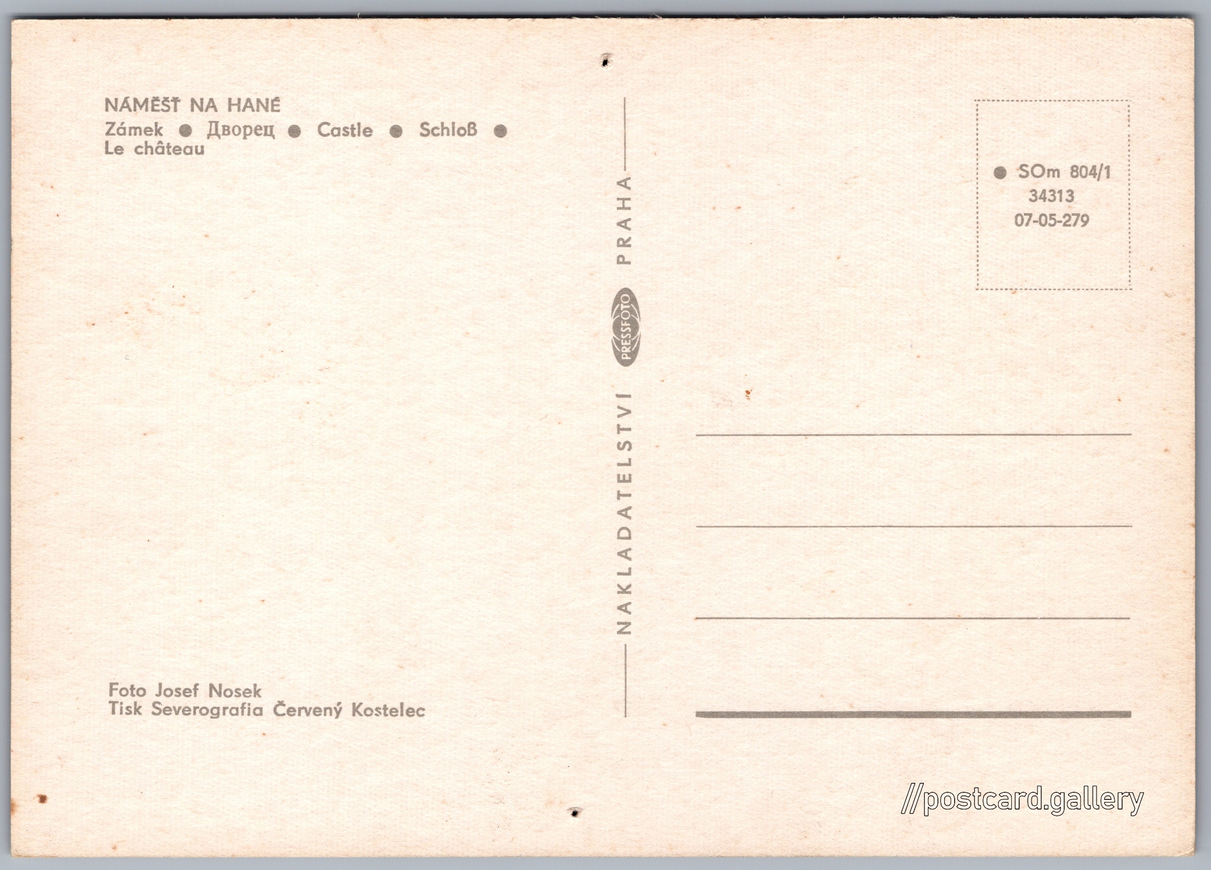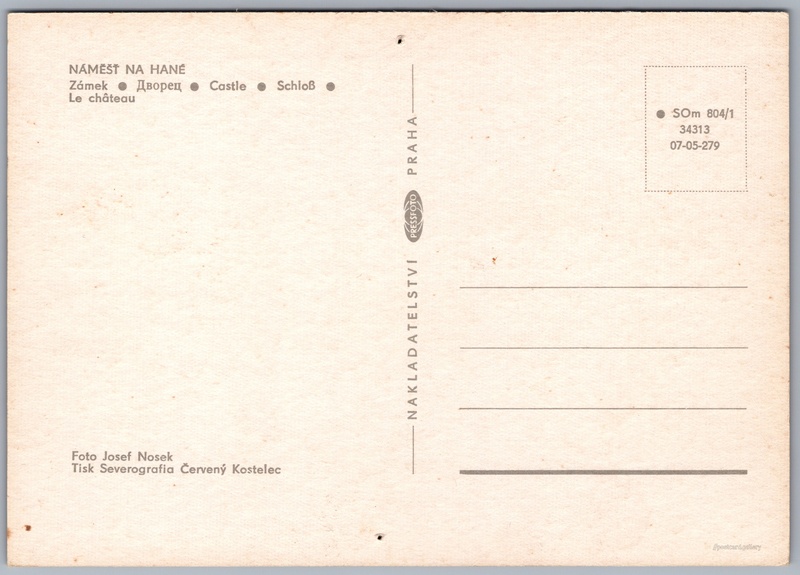 Náměšť na Hané Pokud chcete vidět pohlednice ve vyšším rozlišení nebo zobrazovat jejich zadní stranu, tak se prosím nejdříve přihlašte Přihlásit Zaregistrovat NÁMĚŠŤ NA HANÉ- Zámek- Дворец- Castle- Schloss- Le château Jazyk tištěného textu na pohlednici: čeština Hrad 1, 783 44 Náměšť na Hané, Czechia ukázat na mapě V blízkém okolí místa zobrazeného na pohlednici lze najít 2 jiné pohlednice. Zobrazit blízké pohlednice Vydavatel: PressFoto Praha (Československo) Rok vydání pohlednice: 1972 Velikost (š x v) a tvar pohlednice: 147 x 103 mm (5.79" x 4.06"), obdélník Osoby spjaté s touto pohlednicí: Josef Nosek(Autor fotografie) Čistá pohlednice (neprošlá poštou) Kódy na pohlednici: SOM 804/1m 34313 07-05-279 DiskuseVložit příspěvek Přidat novou složku ... Spravovat složky ...