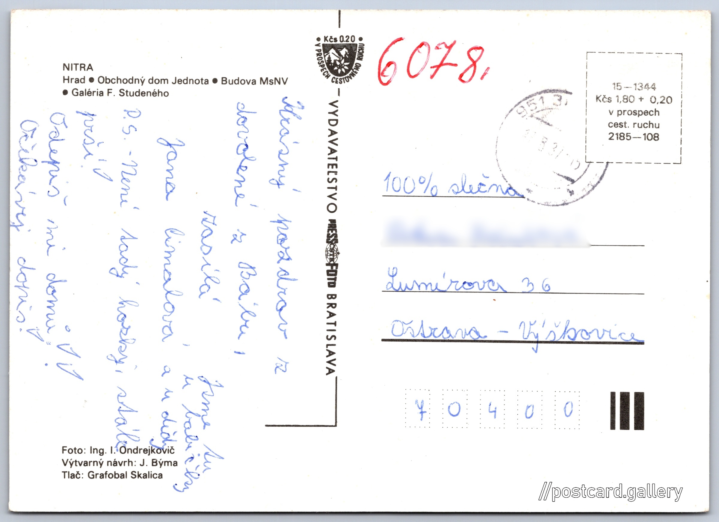 Nitra Pokud chcete vidět pohlednice ve vyšším rozlišení nebo zobrazovat jejich zadní stranu, tak se prosím nejdříve přihlašte Přihlásit Zaregistrovat Nitra NITRA- Hrad- Obchodný dom Jednota- Budova MsNV- Galéria F. Studeného Jazyk tištěného textu na pohlednici: slovenština Nitranský hrad, Zámek, Nitra, Slovensko ukázat na mapě V blízkém okolí místa zobrazeného na pohlednici lze najít 6 jiných pohlednic. Zobrazit blízké pohlednice Vydavatel: PressFoto Bratislava (Československo) Rok vydání pohlednice: 1985 Velikost (š x v) a tvar pohlednice: 147 x 105 mm (5.79" x 4.13"), obdélník Osoby spjaté s touto pohlednicí: J. Býma(Design pohlednice) Ivan Ondrejkovič(Autor fotografie) Prošlá poštou Ceny: Cena pohlednice: 1,80 Kčs (CSK) (+0,20 Kčs přípl. na tur. ruch) Kódy na pohlednici: 15-1344 2185-108 DiskuseVložit příspěvek Přidat novou složku ... Spravovat složky ...