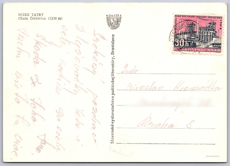 Nízké Tatry, chata Čertovica Pokud chcete vidět pohlednice ve vyšším rozlišení nebo zobrazovat jejich zadní stranu, tak se prosím nejdříve přihlašte Přihlásit Zaregistrovat NÍZKE TATRYChata Čertovica (1238 m) Jazyk tištěného textu na pohlednici: slovenština Jarabá 74 ukázat na mapě V blízkém okolí místa zobrazeného na pohlednici lze najít 4 jiné pohlednice. Zobrazit blízké pohlednice Vydavatel: VPL (Československo) Odhadované datum vydání pohlednice: 1958 - 1961 Pomozte nám zpřesnit rok vzniku pohlednice Velikost (š x v) a tvar pohlednice: 144 x 101 mm (5.67" x 3.98"), obdélník Prošlá poštou:Datum na razítku: 23.1.1961 Ceny: Příplatek na tur. ruch: 0,20 Kčs (CSK))Vyplacené známky: 0,30 Kčs (CSK) DiskuseVložit příspěvek Přidat novou složku ... Spravovat složky ...