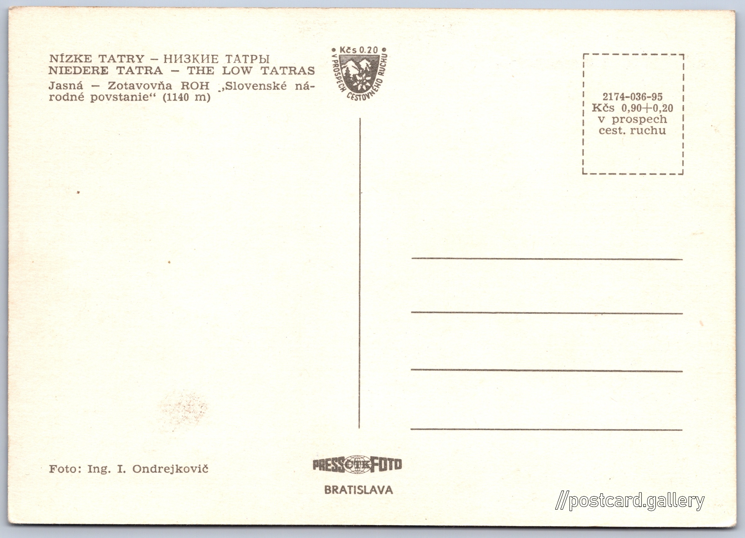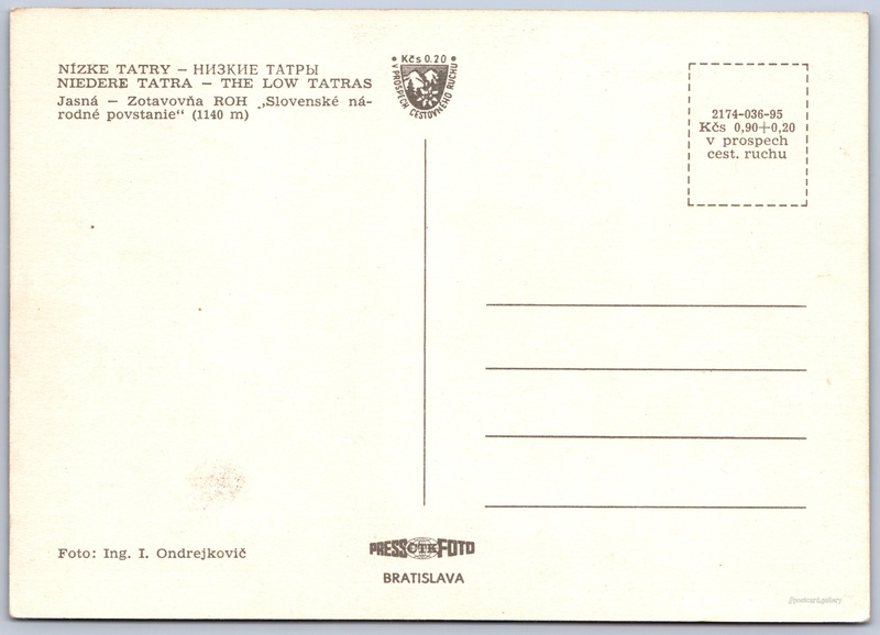 Nízke Tatry, Jasná Pokud chcete vidět pohlednice ve vyšším rozlišení nebo zobrazovat jejich zadní stranu, tak se prosím nejdříve přihlašte Přihlásit Zaregistrovat Nízke Tatry, Jasná NİZKE TATRY - НИЗКИЕ ТАТРЫNIEDERE TATRA - THE LOW TATRASJasná - Zotavovňa ROH "Slovenské národné povstanie" (1140 m) Jazyk tištěného textu na pohlednici: slovenština Hotel SOREA MARMOT, Jasná pod Chopkom 104, Demänovská Dolina, Slovensko ukázat na mapě V blízkém okolí místa zobrazeného na pohlednici lze najít 30 jiných pohlednic. Zobrazit blízké pohlednice Vydavatel: PressFoto Bratislava (Československo) Datum vydání není známo Pomozte nám odhadnout datum vzniku pohlednice Velikost (š x v) a tvar pohlednice: 148 x 105 mm (5.83" x 4.13"), obdélník Osoby spjaté s touto pohlednicí: Ivan Ondrejkovič(Autor fotografie) Čistá pohlednice (neprošlá poštou) Ceny: Cena pohlednice: 0,90 Kčs (CSK) (+0,20 Kčs přípl. na tur. ruch) Kódy na pohlednici: 2174-036-95 DiskuseVložit příspěvek Přidat novou složku ... Spravovat složky ...