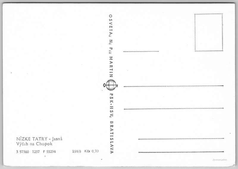 Nízké Tatry, lanovka na Chopok Pokud chcete vidět pohlednice ve vyšším rozlišení nebo zobrazovat jejich zadní stranu, tak se prosím nejdříve přihlašte Přihlásit Zaregistrovat NÍZKE TATRY - JasnáVýťah na Chopok Jazyk tištěného textu na pohlednici: slovenština Demänovská Dolina ukázat na mapě V blízkém okolí místa zobrazeného na pohlednici lze najít 31 jiných pohlednic. Zobrazit blízké pohlednice Vydavatel: Osveta, n. p., Martin PŠK - Bratislava (Československo) Rok vydání pohlednice: prosinec, 1957 Velikost (š x v) a tvar pohlednice: 147 x 103 mm (5.79" x 4.06"), obdélník Čistá pohlednice (neprošlá poštou) Ceny: Cena pohlednice: 0,70 Kčs (CSK) Kódy na pohlednici: 3 57360 1257 F 55294 184/8 DiskuseVložit příspěvek Přidat novou složku ... Spravovat složky ...