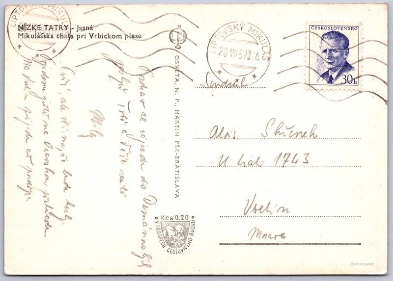Nízké Tatry, Mikulášska chata 4/31 Pokud chcete vidět pohlednice ve vyšším rozlišení nebo zobrazovat jejich zadní stranu, tak se prosím nejdříve přihlašte Přihlásit Zaregistrovat NÍZKE TATRY- JasnáMikulášska chata pri Vrbickom plese Jazyk tištěného textu na pohlednici: slovenština Mikulášska chata, Budova, Demänovská Dolina 75, Demänovská Dolina, Slovensko ukázat na mapě V blízkém okolí místa zobrazeného na pohlednici lze najít 30 jiných pohlednic. Zobrazit blízké pohlednice Vydavatel: Osveta, n. p., Martin PŠK - Bratislava (Československo) Odhadované datum vydání pohlednice: 1956 - 1959 Pomozte nám zpřesnit rok vzniku pohlednice Velikost (š x v) a tvar pohlednice: 147 x 103 mm (5.79" x 4.06"), obdélník Prošlá poštou:Datum na razítku: 20.7.1959 Ceny: Příplatek na tur. ruch: 0,20 Kčs (CSK))Vyplacené známky: 0,30 Kčs (CSK) DiskuseVložit příspěvek Přidat novou složku ... Spravovat složky ...