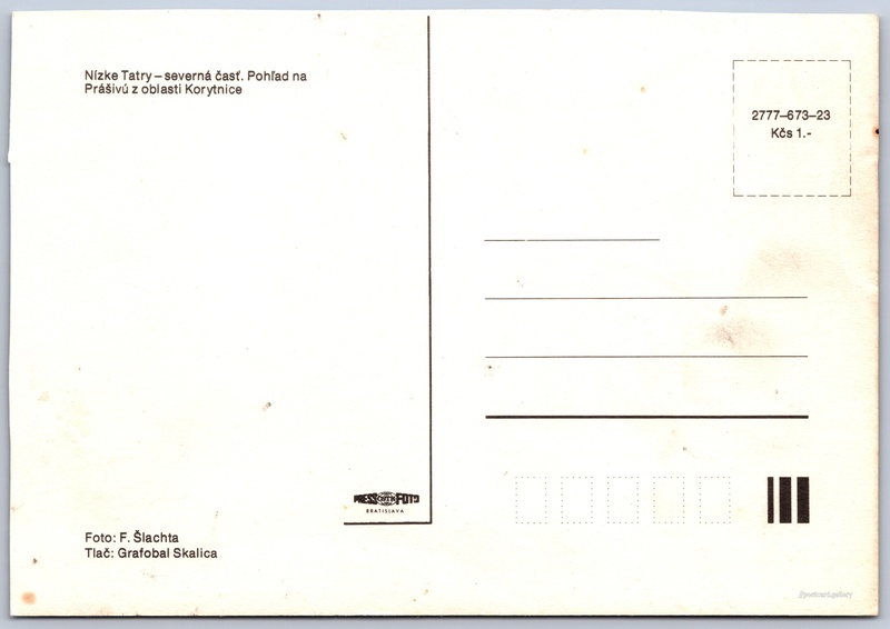 Nízké Tatry, pohled na Prášivú Pokud chcete vidět pohlednice ve vyšším rozlišení nebo zobrazovat jejich zadní stranu, tak se prosím nejdříve přihlašte Přihlásit Zaregistrovat Nízke Tatry - severná časť. Pohľad na Prášivú z oblasti Korytnice Jazyk tištěného textu na pohlednici: slovenština Prašivá (1667 m), Hora, výškový bod, Demänovská Dolina, Slovensko ukázat na mapě V blízkém okolí místa zobrazeného na pohlednici lze najít 25 jiných pohlednic. Zobrazit blízké pohlednice Vydavatel: PressFoto Bratislava (Československo) Datum vydání není známo Pomozte nám odhadnout datum vzniku pohlednice Velikost (š x v) a tvar pohlednice: 148 x 103 mm (5.83" x 4.06"), obdélník Osoby spjaté s touto pohlednicí: František Šlachta(Autor fotografie) Čistá pohlednice (neprošlá poštou) Ceny: Cena pohlednice: 1,00 Kčs (CSK) Kódy na pohlednici: 2777-673-23 DiskuseVložit příspěvek Přidat novou složku ... Spravovat složky ...