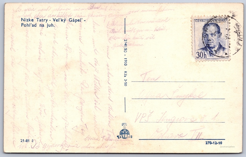 Nízké Tatry, Velký Gápeľ, pohled na jih Pokud chcete vidět pohlednice ve vyšším rozlišení nebo zobrazovat jejich zadní stranu, tak se prosím nejdříve přihlašte Přihlásit Zaregistrovat Nízke Tatry - Vel'ký Gápel' - Pohl'ad na juh. Jazyk tištěného textu na pohlednici: slovenština Velký Gápel (1776 m), Hora, výškový bod, Brezno, Slovensko ukázat na mapě V blízkém okolí místa zobrazeného na pohlednici lze najít 8 jiných pohlednic. Zobrazit blízké pohlednice Vydavatel: Tatran (Československo) Datum vydání není známo Pomozte nám odhadnout datum vzniku pohlednice Velikost (š x v) a tvar pohlednice: 137 x 86 mm (5.39" x 3.39"), obdélník Prošlá poštou Ceny: Cena pohlednice: 2,50 Kčs (CSK)Vyplacené známky: 0,30 Kčs (CSK) Kódy na pohlednici: 2141|50 1950 21-81 c 270-12-10 DiskuseVložit příspěvek Přidat novou složku ... Spravovat složky ...