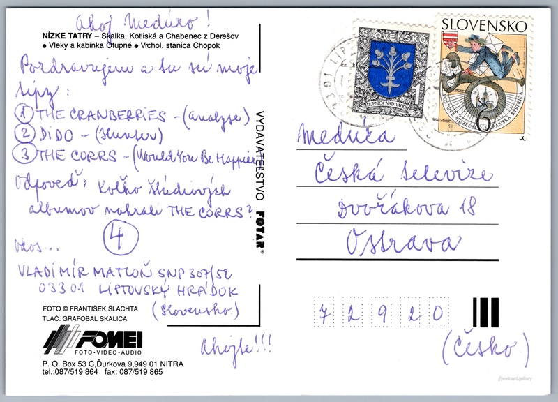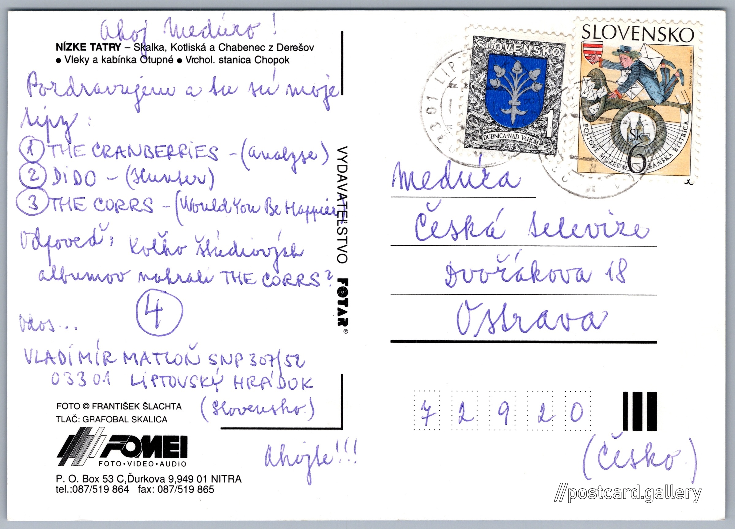 Nízke Tatry 7/22 Pokud chcete vidět pohlednice ve vyšším rozlišení nebo zobrazovat jejich zadní stranu, tak se prosím nejdříve přihlašte Přihlásit Zaregistrovat Nízke Tatry NÍZKE TATRY- Skalka, Kotliská a Chabenec z Derešov- Vleky a kabínka Otupné- Vrchol. stanica Chopok Jazyk tištěného textu na pohlednici: slovenština Chabenec (1955 m), Hora, výškový bod, Jasenie, Slovensko ukázat na mapě V blízkém okolí místa zobrazeného na pohlednici lze najít 34 jiných pohlednic. Zobrazit blízké pohlednice Vydavatel: FOTAR (Slovensko) Datum vydání není známo Pomozte nám odhadnout datum vzniku pohlednice Velikost (š x v) a tvar pohlednice: 148 x 105 mm (5.83" x 4.13"), obdélník Osoby spjaté s touto pohlednicí: František Šlachta(Autor fotografie) Prošlá poštou Ceny: Vyplacené známky: 7,00 Sk (SKK) DiskuseVložit příspěvek Přidat novou složku ... Spravovat složky ...